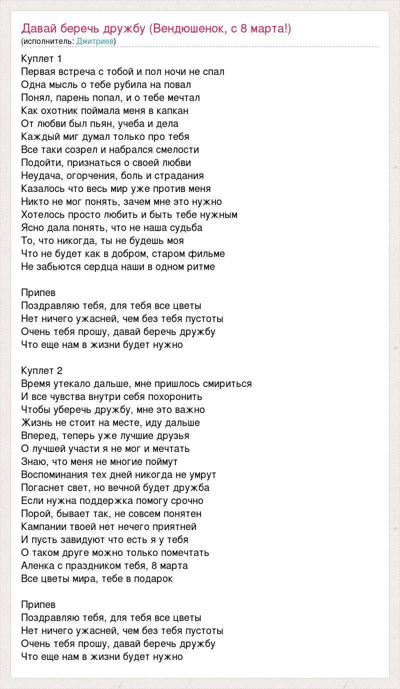 Куплет 1 Первая встреча с тобой и пол ночи не спал Одна мысль о тебе рубила на повал Понял, парень попал, и о тебе мечтал Как охотник поймала меня в капкан От любви был пьян, учеба и дела Каждый миг думал только про тебя Все таки созрел и набрался смелости Подойти, признаться о своей любви Неудача, огорчения, боль и страдания Казалось что весь мир уже против меня Никто не мог понять, зачем мне это нужно Хотелось просто любить и быть тебе нужным Ясно дала понять, что не наша судьба То, что никогда, ты не будешь моя Что не будет как в добром, старом фильме Не забьются сердца наши в одном ритме Припев Поздравляю тебя, для тебя все цветы Нет ничего ужасней, чем без тебя пустоты Очень тебя прошу, давай беречь дружбу Что еще нам в жизни будет нужно Куплет 2 Время утекало дальше, мне пришлось смириться И все чувства внутри себя похоронить Чтобы уберечь дружбу, мне это важно Жизнь не стоит на месте, иду дальше Вперед, теперь уже лучшие друзья О лучшей участи я не мог и мечтать Знаю, что меня не многие поймут Воспоминания тех дней никогда не умрут Погаснет свет, но вечной будет дружба Если нужна поддержка помогу срочно Порой, бывает так, не совсем понятен Кампании твоей нет нечего приятней И пусть завидуют что есть я у тебя О таком друге можно только помечтать Аленка с праздником тебя, 8 марта Все цветы мира, тебе в подарок Припев Поздравляю тебя, для тебя все цветы Нет ничего ужасней, чем без тебя пустоты Очень тебя прошу, давай беречь дружбу Что еще нам в жизни будет нужно