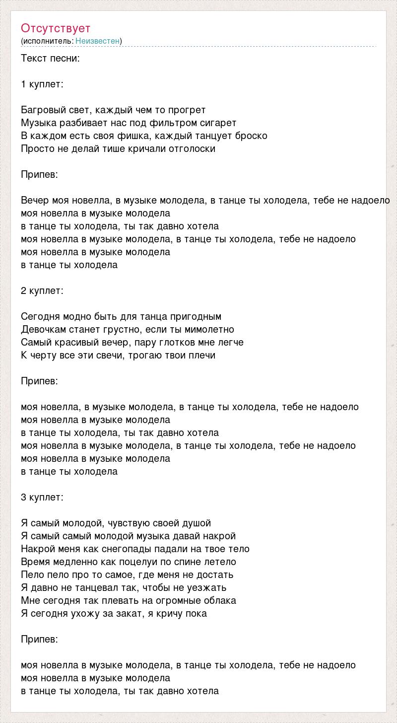 Текст песни: 1 куплет: Багровый свет, каждый чем то прогрет Музыка разбивает нас под фильтром сигарет В каждом есть своя фишка, каждый танцует броско Просто не делай тише кричали отголоски Припев: Вечер моя новелла, в музыке молодела, в танце ты холодела, тебе не надоело моя новелла в музыке молодела в танце ты холодела, ты так давно хотела моя новелла в музыке молодела, в танце ты холодела, тебе не надоело моя новелла в музыке молодела в танце ты холодела 2 куплет: Сегодня модно быть для танца пригодным Девочкам станет грустно, если ты мимолетно Самый красивый вечер, пару глотков мне легче К черту все эти свечи, трогаю твои плечи Припев: моя новелла, в музыке молодела, в танце ты холодела, тебе не надоело моя новелла в музыке молодела в танце ты холодела, ты так давно хотела моя новелла в музыке молодела, в танце ты холодела, тебе не надоело моя новелла в музыке молодела в танце ты холодела 3 куплет: Я самый молодой, чувствую своей душой Я самый самый молодой музыка давай накрой Накрой меня как снегопады падали на твое тело Время медленно как поцелуи по спине летело Пело пело про то самое, где меня не достать Я давно не танцевал так, чтобы не уезжать Мне сегодня так плевать на огромные облака Я сегодня ухожу за закат, я кричу пока Припев: моя новелла в музыке молодела, в танце ты холодела, тебе не надоело моя новелла в музыке молодела в танце ты холодела, ты так давно хотела