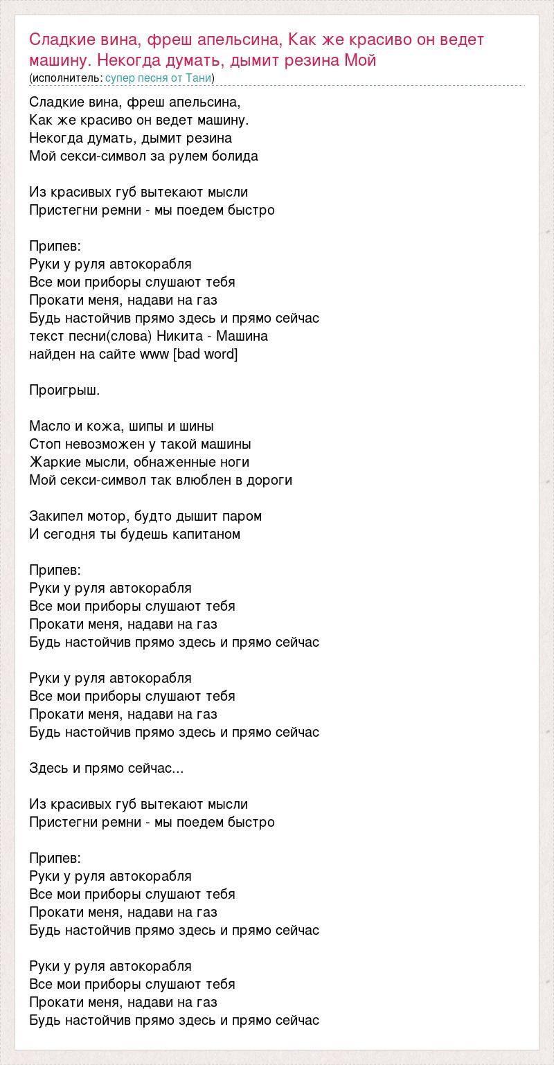 Сладкие вина, фреш апельсина, Как же красиво он ведет машину. Некогда думать, дымит резина Мой секси-символ за рулем болида Из красивых губ вытекают мысли Пристегни ремни - мы поедем быстро Припев: Руки у руля автокорабля Все мои приборы слушают тебя Прокати меня, надави на газ Будь настойчив прямо здесь и прямо сейчас текст песни(слова) Никита - Машина найден на сайте www [bad word] Проигрыш. Масло и кожа, шипы и шины Стоп невозможен у такой машины Жаркие мысли, обнаженные ноги Мой секси-символ так влюблен в дороги Закипел мотор, будто дышит паром И сегодня ты будешь капитаном Припев: Руки у руля автокорабля Все мои приборы слушают тебя Прокати меня, надави на газ Будь настойчив прямо здесь и прямо сейчас Руки у руля автокорабля Все мои приборы слушают тебя Прокати меня, надави на газ Будь настойчив прямо здесь и прямо сейчас Здесь и прямо сейчас... Из красивых губ вытекают мысли Пристегни ремни - мы поедем быстро Припев: Руки у руля автокорабля Все мои приборы слушают тебя Прокати меня, надави на газ Будь настойчив прямо здесь и прямо сейчас Руки у руля автокорабля Все мои приборы слушают тебя Прокати меня, надави на газ Будь настойчив прямо здесь и прямо сейчас