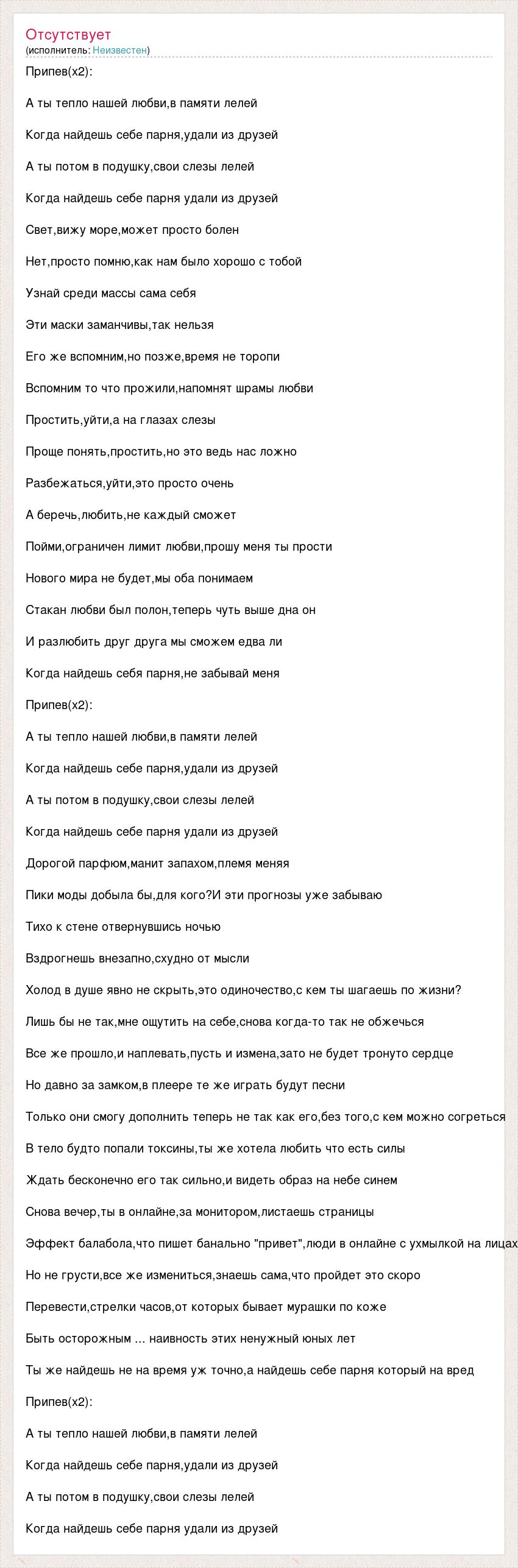 Припев(х2): А ты тепло нашей любви,в памяти лелей Когда найдешь себе парня,удали из друзей А ты потом в подушку,свои слезы лелей Когда найдешь себе парня удали из друзей Свет,вижу море,может просто болен Нет,просто помню,как нам было хорошо с тобой Узнай среди массы сама себя Эти маски заманчивы,так нельзя Его же вспомним,но позже,время не торопи Вспомним то что прожили,напомнят шрамы любви Простить,уйти,а на глазах слезы Проще понять,простить,но это ведь нас ложно Разбежаться,уйти,это просто очень А беречь,любить,не каждый сможет Пойми,ограничен лимит любви,прошу меня ты прости Нового мира не будет,мы оба понимаем Стакан любви был полон,теперь чуть выше дна он И разлюбить друг друга мы сможем едва ли Когда найдешь себя парня,не забывай меня Припев(х2): А ты тепло нашей любви,в памяти лелей Когда найдешь себе парня,удали из друзей А ты потом в подушку,свои слезы лелей Когда найдешь себе парня удали из друзей Дорогой парфюм,манит запахом,племя меняя Пики моды добыла бы,для кого?И эти прогнозы уже забываю Тихо к стене отвернувшись ночью Вздрогнешь внезапно,схудно от мысли Холод в душе явно не скрыть,это одиночество,с кем ты шагаешь по жизни? Лишь бы не так,мне ощутить на себе,снова когда-то так не обжечься Все же прошло,и наплевать,пусть и измена,зато не будет тронуто сердце Но давно за замком,в плеере те же играть будут песни Только они смогу дополнить теперь не так как его,без того,с кем можно согреться В тело будто попали токсины,ты же хотела любить что есть силы Ждать бесконечно его так сильно,и видеть образ на небе синем Снова вечер,ты в онлайне,за монитором,листаешь страницы Эффект балабола,что пишет банально "привет",люди в онлайне с ухмылкой на лицах Но не грусти,все же измениться,знаешь сама,что пройдет это скоро Перевести,стрелки часов,от которых бывает мурашки по коже Быть осторожным ... наивность этих ненужный юных лет Ты же найдешь не на время уж точно,а найдешь себе парня который на вред Припев(х2): А ты тепло нашей любви,в памяти лелей Когда найдешь себе парня,удали из друзей А ты потом в подушку,свои слезы лелей Когда найдешь себе парня удали из друзей