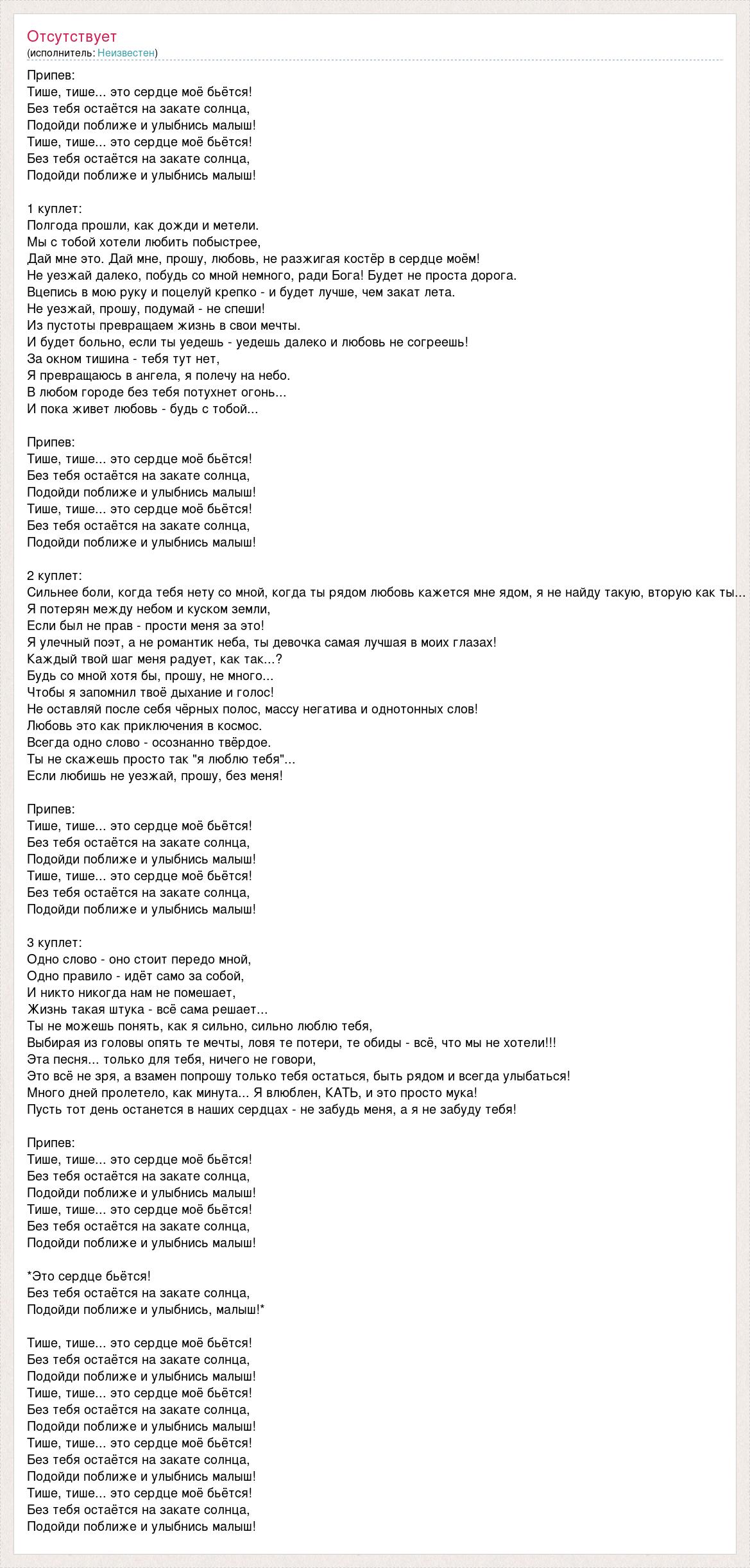 Припев: Тише, тише... это сердце моё бьётся! Без тебя остаётся на закате солнца, Подойди поближе и улыбнись малыш! Тише, тише... это сердце моё бьётся! Без тебя остаётся на закате солнца, Подойди поближе и улыбнись малыш! 1 куплет: Полгода прошли, как дожди и метели. Мы с тобой хотели любить побыстрее, Дай мне это. Дай мне, прошу, любовь, не разжигая костёр в сердце моём! Не уезжай далеко, побудь со мной немного, ради Бога! Будет не проста дорога. Вцепись в мою руку и поцелуй крепко - и будет лучше, чем закат лета. Не уезжай, прошу, подумай - не спеши! Из пустоты превращаем жизнь в свои мечты. И будет больно, если ты уедешь - уедешь далеко и любовь не согреешь! За окном тишина - тебя тут нет, Я превращаюсь в ангела, я полечу на небо. В любом городе без тебя потухнет огонь... И пока живет любовь - будь с тобой... Припев: Тише, тише... это сердце моё бьётся! Без тебя остаётся на закате солнца, Подойди поближе и улыбнись малыш! Тише, тише... это сердце моё бьётся! Без тебя остаётся на закате солнца, Подойди поближе и улыбнись малыш! 2 куплет: Сильнее боли, когда тебя нету со мной, когда ты рядом любовь кажется мне ядом, я не найду такую, вторую как ты... Я потерян между небом и куском земли, Если был не прав - прости меня за это! Я улечный поэт, а не романтик неба, ты девочка самая лучшая в моих глазах! Каждый твой шаг меня радует, как так...? Будь со мной хотя бы, прошу, не много... Чтобы я запомнил твоё дыхание и голос! Не оставляй после себя чёрных полос, массу негатива и однотонных слов! Любовь это как приключения в космос. Всегда одно слово - осознанно твёрдое. Ты не скажешь просто так "я люблю тебя"... Если любишь не уезжай, прошу, без меня! Припев: Тише, тише... это сердце моё бьётся! Без тебя остаётся на закате солнца, Подойди поближе и улыбнись малыш! Тише, тише... это сердце моё бьётся! Без тебя остаётся на закате солнца, Подойди поближе и улыбнись малыш! 3 куплет: Одно слово - оно стоит передо мной, Одно правило - идёт само за собой, И никто никогда нам не помешает, Жизнь такая штука - всё сама решает... Ты не можешь понять, как я сильно, сильно люблю тебя, Выбирая из головы опять те мечты, ловя те потери, те обиды - всё, что мы не хотели!!! Эта песня... только для тебя, ничего не говори, Это всё не зря, а взамен попрошу только тебя остаться, быть рядом и всегда улыбаться! Много дней пролетело, как минута... Я влюблен, КАТЬ, и это просто мука! Пусть тот день останется в наших сердцах - не забудь меня, а я не забуду тебя! Припев: Тише, тише... это сердце моё бьётся! Без тебя остаётся на закате солнца, Подойди поближе и улыбнись малыш! Тише, тише... это сердце моё бьётся! Без тебя остаётся на закате солнца, Подойди поближе и улыбнись малыш! *Это сердце бьётся! Без тебя остаётся на закате солнца, Подойди поближе и улыбнись, малыш!* Тише, тише... это сердце моё бьётся! Без тебя остаётся на закате солнца, Подойди поближе и улыбнись малыш! Тише, тише... это сердце моё бьётся! Без тебя остаётся на закате солнца, Подойди поближе и улыбнись малыш! Тише, тише... это сердце моё бьётся! Без тебя остаётся на закате солнца, Подойди поближе и улыбнись малыш! Тише, тише... это сердце моё бьётся! Без тебя остаётся на закате солнца, Подойди поближе и улыбнись малыш!