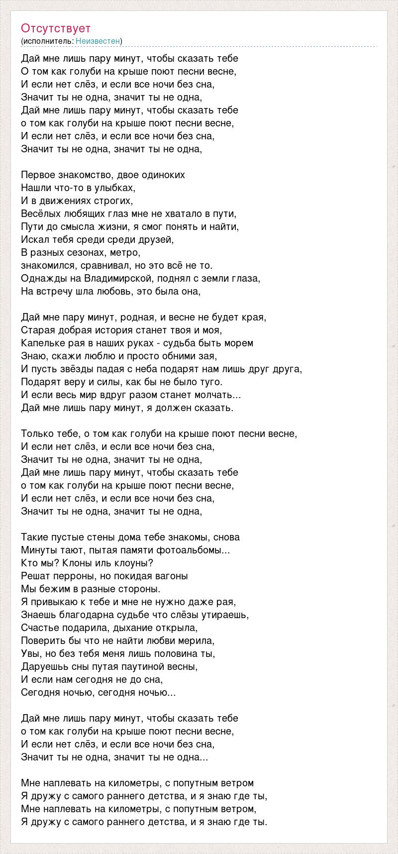 Дай мне лишь пару минут, чтобы сказать тебе О том как голуби на крыше поют песни весне, И если нет слёз, и если все ночи без сна, Значит ты не одна, значит ты не одна, Дай мне лишь пару минут, чтобы сказать тебе о том как голуби на крыше поют песни весне, И если нет слёз, и если все ночи без сна, Значит ты не одна, значит ты не одна, Первое знакомство, двое одиноких Нашли что-то в улыбках, И в движениях строгих, Весёлых любящих глаз мне не хватало в пути, Пути до смысла жизни, я смог понять и найти, Искал тебя среди среди друзей, В разных сезонах, метро, знакомился, сравнивал, но это всё не то. Однажды на Владимирской, поднял с земли глаза, На встречу шла любовь, это была она, Дай мне пару минут, родная, и весне не будет края, Старая добрая история станет твоя и моя, Капельке рая в наших руках - судьба быть морем Знаю, скажи люблю и просто обними зая, И пусть звёзды падая с неба подарят нам лишь друг друга, Подарят веру и силы, как бы не было туго. И если весь мир вдруг разом станет молчать... Дай мне лишь пару минут, я должен сказать. Только тебе, о том как голуби на крыше поют песни весне, И если нет слёз, и если все ночи без сна, Значит ты не одна, значит ты не одна, Дай мне лишь пару минут, чтобы сказать тебе о том как голуби на крыше поют песни весне, И если нет слёз, и если все ночи без сна, Значит ты не одна, значит ты не одна, Такие пустые стены дома тебе знакомы, снова Минуты тают, пытая памяти фотоальбомы... Кто мы? Клоны иль клоуны? Решат перроны, но покидая вагоны Мы бежим в разные стороны. Я привыкаю к тебе и мне не нужно даже рая, Знаешь благодарна судьбе что слёзы утираешь, Счастье подарила, дыхание открыла, Поверить бы что не найти любви мерила, Увы, но без тебя меня лишь половина ты, Даруешьь сны путая паутиной весны, И если нам сегодня не до сна, Сегодня ночью, сегодня ночью... Дай мне лишь пару минут, чтобы сказать тебе о том как голуби на крыше поют песни весне, И если нет слёз, и если все ночи без сна, Значит ты не одна, значит ты не одна... Мне наплевать на километры, с попутным ветром Я дружу с самого раннего детства, и я знаю где ты, Мне наплевать на километры, с попутным ветром, Я дружу с самого раннего детства, и я знаю где ты.
