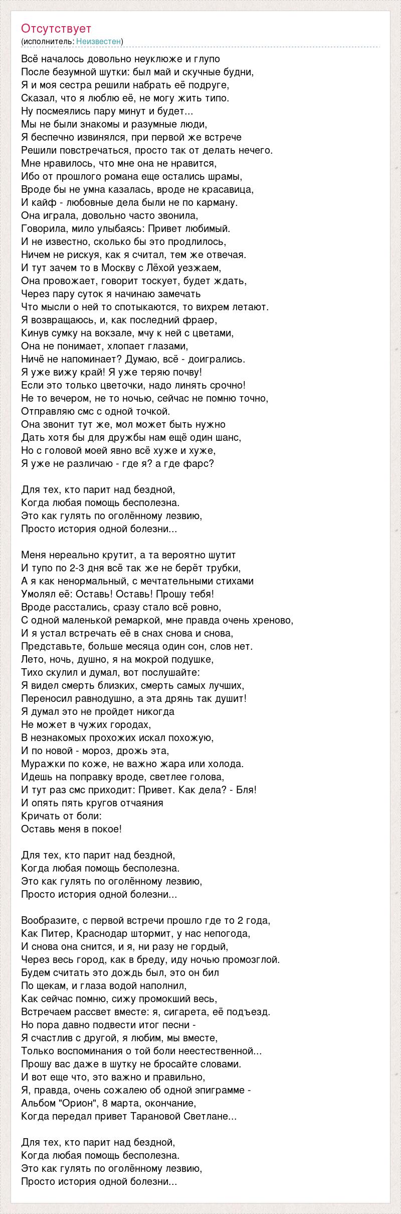 Всё началось довольно неуклюже и глупо После безумной шутки: был май и скучные будни, Я и моя сестра решили набрать её подруге, Сказал, что я люблю её, не могу жить типо. Ну посмеялись пару минут и будет... Мы не были знакомы и разумные люди, Я беспечно извинялся, при первой же встрече Решили повстречаться, просто так от делать нечего. Мне нравилось, что мне она не нравится, Ибо от прошлого романа еще остались шрамы, Вроде бы не умна казалась, вроде не красавица, И кайф - любовные дела были не по карману. Она играла, довольно часто звонила, Говорила, мило улыбаясь: Привет любимый. И не известно, сколько бы это продлилось, Ничем не рискуя, как я считал, тем же отвечая. И тут зачем то в Москву с Лёхой уезжаем, Она провожает, говорит тоскует, будет ждать, Через пару суток я начинаю замечать Что мысли о ней то спотыкаются, то вихрем летают. Я возвращаюсь, и, как последний фраер, Кинув сумку на вокзале, мчу к ней с цветами, Она не понимает, хлопает глазами, Ничё не напоминает? Думаю, всё - доигрались. Я уже вижу край! Я уже теряю почву! Если это только цветочки, надо линять срочно! Не то вечером, не то ночью, сейчас не помню точно, Отправляю смс с одной точкой. Она звонит тут же, мол может быть нужно Дать хотя бы для дружбы нам ещё один шанс, Но с головой моей явно всё хуже и хуже, Я уже не различаю - где я? а где фарс? Для тех, кто парит над бездной, Когда любая помощь бесполезна. Это как гулять по оголённому лезвию, Просто история одной болезни... Меня нереально крутит, а та вероятно шутит И тупо по 2-3 дня всё так же не берёт трубки, А я как ненормальный, с мечтательными стихами Умолял её: Оставь! Оставь! Прошу тебя! Вроде расстались, сразу стало всё ровно, С одной маленькой ремаркой, мне правда очень хреново, И я устал встречать её в снах снова и снова, Представьте, больше месяца один сон, слов нет. Лето, ночь, душно, я на мокрой подушке, Тихо скулил и думал, вот послушайте: Я видел смерть близких, смерть самых лучших, Переносил равнодушно, а эта дрянь так душит! Я думал это не пройдет никогда Не может в чужих городах, В незнакомых прохожих искал похожую, И по новой - мороз, дрожь эта, Муражки по коже, не важно жара или холода. Идешь на поправку вроде, светлее голова, И тут раз смс приходит: Привет. Как дела? - Бля! И опять пять кругов отчаяния Кричать от боли: Оставь меня в покое! Для тех, кто парит над бездной, Когда любая помощь бесполезна. Это как гулять по оголённому лезвию, Просто история одной болезни... Вообразите, с первой встречи прошло где то 2 года, Как Питер, Краснодар штормит, у нас непогода, И снова она снится, и я, ни разу не гордый, Через весь город, как в бреду, иду ночью промозглой. Будем считать это дождь был, это он бил По щекам, и глаза водой наполнил, Как сейчас помню, сижу промокший весь, Встречаем рассвет вместе: я, сигарета, её подъезд. Но пора давно подвести итог песни - Я счастлив с другой, я любим, мы вместе, Только воспоминания о той боли неестественной... Прошу вас даже в шутку не бросайте словами. И вот еще что, это важно и правильно, Я, правда, очень сожалею об одной эпиграмме - Альбом "Орион", 8 марта, окончание, Когда передал привет Тарановой Светлане... Для тех, кто парит над бездной, Когда любая помощь бесполезна. Это как гулять по оголённому лезвию, Просто история одной болезни...