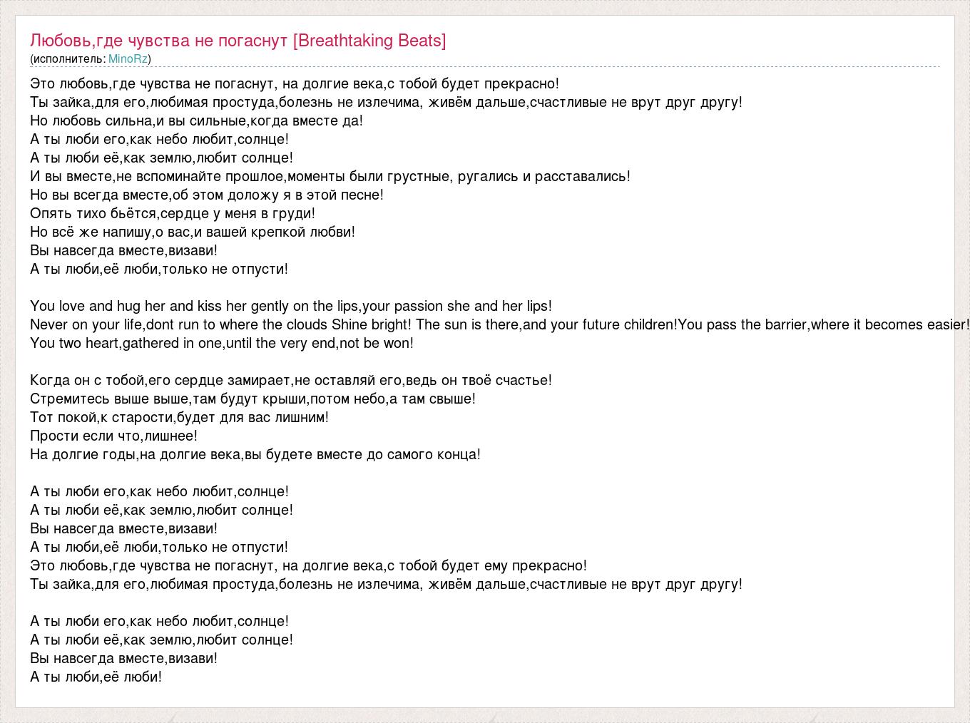 Это любовь,где чувства не погаснут, на долгие века,с тобой будет прекрасно! Ты зайка,для его,любимая простуда,болезнь не излечима, живём дальше,счастливые не врут друг другу! Но любовь сильна,и вы сильные,когда вместе да! А ты люби его,как небо любит,солнце! А ты люби её,как землю,любит солнце! И вы вместе,не вспоминайте прошлое,моменты были грустные, ругались и расставались! Но вы всегда вместе,об этом доложу я в этой песне! Опять тихо бьётся,сердце у меня в груди! Но всё же напишу,о вас,и вашей крепкой любви! Вы навсегда вместе,визави! А ты люби,её люби,только не отпусти! You love and hug her and kiss her gently on the lips,your passion she and her lips! Never on your life,dont run to where the clouds Shine bright! The sun is there,and your future children!You pass the barrier,where it becomes easier! You two heart,gathered in one,until the very end,not be won! Когда он с тобой,его сердце замирает,не оставляй его,ведь он твоё счастье! Стремитесь выше выше,там будут крыши,потом небо,а там свыше! Тот покой,к старости,будет для вас лишним! Прости если что,лишнее! На долгие годы,на долгие века,вы будете вместе до самого конца! А ты люби его,как небо любит,солнце! А ты люби её,как землю,любит солнце! Вы навсегда вместе,визави! А ты люби,её люби,только не отпусти! Это любовь,где чувства не погаснут, на долгие века,с тобой будет ему прекрасно! Ты зайка,для его,любимая простуда,болезнь не излечима, живём дальше,счастливые не врут друг другу! А ты люби его,как небо любит,солнце! А ты люби её,как землю,любит солнце! Вы навсегда вместе,визави! А ты люби,её люби!