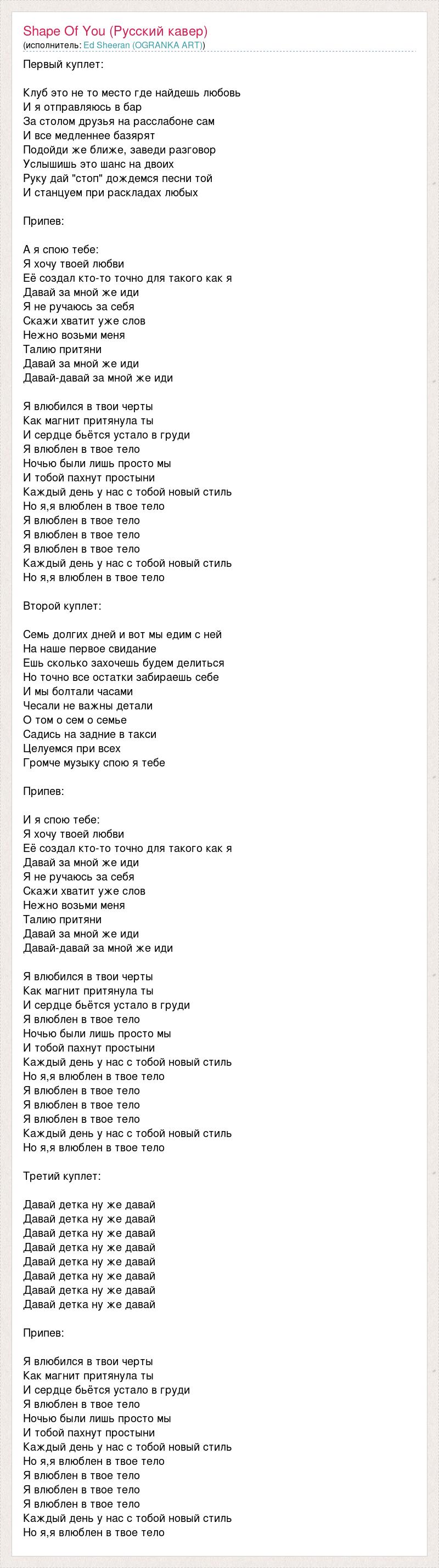 Первый куплет: Клуб это не то место где найдешь любовь И я отправляюсь в бар За столом друзья на расслабоне сам И все медленнее базярят Подойди же ближе, заведи разговор Услышишь это шанс на двоих Руку дай "стоп" дождемся песни той И станцуем при раскладах любых Припев: А я спою тебе: Я хочу твоей любви Её создал кто-то точно для такого как я Давай за мной же иди Я не ручаюсь за себя Скажи хватит уже слов Нежно возьми меня Талию притяни Давай за мной же иди Давай-давай за мной же иди Я влюбился в твои черты Как магнит притянула ты И сердце бьётся устало в груди Я влюблен в твое тело Ночью были лишь просто мы И тобой пахнут простыни Каждый день у нас с тобой новый стиль Но я,я влюблен в твое тело Я влюблен в твое тело Я влюблен в твое тело Я влюблен в твое тело Каждый день у нас с тобой новый стиль Но я,я влюблен в твое тело Второй куплет: Семь долгих дней и вот мы едим с ней На наше первое свидание Ешь сколько захочешь будем делиться Но точно все остатки забираешь себе И мы болтали часами Чесали не важны детали О том о сем о семье Садись на задние в такси Целуемся при всех Громче музыку спою я тебе Припев: И я спою тебе: Я хочу твоей любви Её создал кто-то точно для такого как я Давай за мной же иди Я не ручаюсь за себя Скажи хватит уже слов Нежно возьми меня Талию притяни Давай за мной же иди Давай-давай за мной же иди Я влюбился в твои черты Как магнит притянула ты И сердце бьётся устало в груди Я влюблен в твое тело Ночью были лишь просто мы И тобой пахнут простыни Каждый день у нас с тобой новый стиль Но я,я влюблен в твое тело Я влюблен в твое тело Я влюблен в твое тело Я влюблен в твое тело Каждый день у нас с тобой новый стиль Но я,я влюблен в твое тело Третий куплет: Давай детка ну же давай Давай детка ну же давай Давай детка ну же давай Давай детка ну же давай Давай детка ну же давай Давай детка ну же давай Давай детка ну же давай Давай детка ну же давай Припев: Я влюбился в твои черты Как магнит притянула ты И сердце бьётся устало в груди Я влюблен в твое тело Ночью были лишь просто мы И тобой пахнут простыни Каждый день у нас с тобой новый стиль Но я,я влюблен в твое тело Я влюблен в твое тело Я влюблен в твое тело Я влюблен в твое тело Каждый день у нас с тобой новый стиль Но я,я влюблен в твое тело