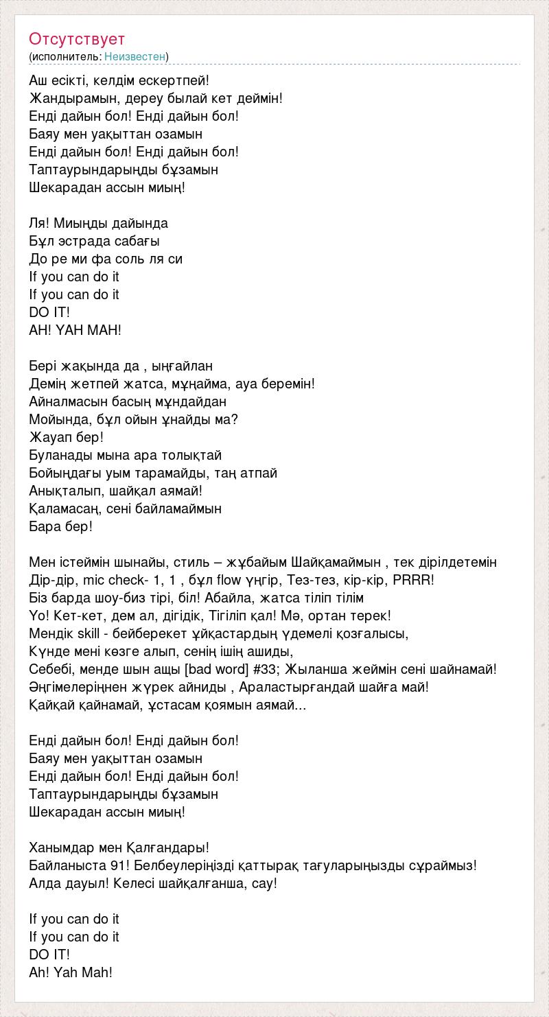Аш есікті, келдім ескертпей! Жандырамын, дереу былай кет деймін! Енді дайын бол! Енді дайын бол! Баяу мен уақыттан озамын Енді дайын бол! Енді дайын бол! Таптаурындарыңды бұзамын Шекарадан ассын миың! Ля! Миыңды дайында Бұл эстрада сабағы До ре ми фа соль ля си If you can do it If you can do it DO IT! AH! YAH MAH! Бері жақында да , ыңғайлан Демің жетпей жатса, мұңайма, ауа беремін! Айналмасын басың мұндайдан Мойында, бұл ойын ұнайды ма? Жауап бер! Буланады мына ара толықтай Бойыңдағы уым тарамайды, таң атпай Анықталып, шайқал аямай! Қаламасаң, сені байламаймын Бара бер! Мен істеймін шынайы, стиль – жұбайым Шайқамаймын , тек дірілдетемін Дір-дір, mic check- 1, 1 , бұл flow үңгір, Тез-тез, кір-кір, PRRR! Біз барда шоу-биз тірі, біл! Абайла, жатса тіліп тілім Yo! Кет-кет, дем ал, дігідік, Тігіліп қал! Мә, ортан терек! Мендік skill - бейберекет ұйқастардың үдемелі қозғалысы, Күнде мені көзге алып, сенің ішің ашиды, Себебі, менде шын ащы [bad word] #33; Жыланша жеймін сені шайнамай! Әңгімелеріңнен жүрек айниды , Араластырғандай шайға май! Қайқай қайнамай, ұстасам қоямын аямай... Енді дайын бол! Енді дайын бол! Баяу мен уақыттан озамын Енді дайын бол! Енді дайын бол! Таптаурындарыңды бұзамын Шекарадан ассын миың! Ханымдар мен Қалғандары! Байланыста 91! Белбеулеріңізді қаттырақ тағуларыңызды сұраймыз! Алда дауыл! Келесі шайқалғанша, сау! If you can do it If you can do it DO IT! Ah! Yah Mah!