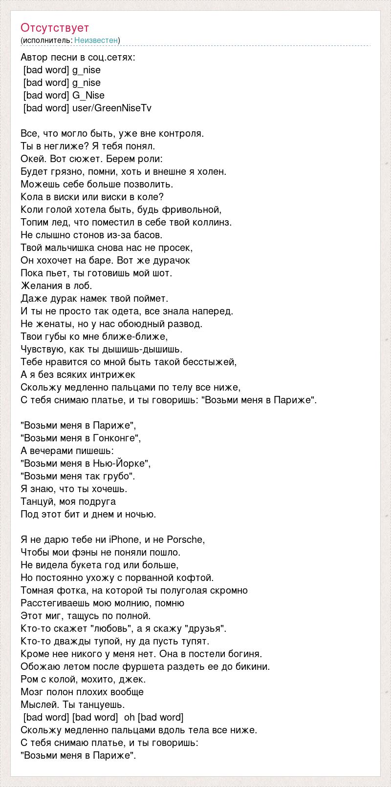 Автор песни в соц.сетях: [bad word] g_nise [bad word] g_nise [bad word] G_Nise [bad word] user/GreenNiseTv Все, что могло быть, уже вне контроля. Ты в неглиже? Я тебя понял. Окей. Вот сюжет. Берем роли: Будет грязно, помни, хоть и внешне я холен. Можешь себе больше позволить. Кола в виски или виски в коле? Коли голой хотела быть, будь фривольной, Топим лед, что поместил в себе твой коллинз. Не слышно стонов из-за басов. Твой мальчишка снова нас не просек, Он хохочет на баре. Вот же дурачок Пока пьет, ты готовишь мой шот. Желания в лоб. Даже дурак намек твой поймет. И ты не просто так одета, все знала наперед. Не женаты, но у нас обоюдный развод. Твои губы ко мне ближе-ближе, Чувствую, как ты дышишь-дышишь. Тебе нравится со мной быть такой бесстыжей, А я без всяких интрижек Скольжу медленно пальцами по телу все ниже, С тебя снимаю платье, и ты говоришь: "Возьми меня в Париже". "Возьми меня в Париже", "Возьми меня в Гонконге", А вечерами пишешь: "Возьми меня в Нью-Йорке", "Возьми меня так грубо". Я знаю, что ты хочешь. Танцуй, моя подруга Под этот бит и днем и ночью. Я не дарю тебе ни iPhone, и не Porsche, Чтобы мои фэны не поняли пошло. Не видела букета год или больше, Но постоянно ухожу с порванной кофтой. Томная фотка, на которой ты полуголая скромно Расстегиваешь мою молнию, помню Этот миг, тащусь по полной. Кто-то скажет "любовь", а я скажу "друзья". Кто-то дважды тупой, ну да пусть тупят. Кроме нее никого у меня нет. Она в постели богиня. Обожаю летом после фуршета раздеть ее до бикини. Ром с колой, мохито, джек. Мозг полон плохих вообще Мыслей. Ты танцуешь. [bad word] [bad word] oh [bad word] Скольжу медленно пальцами вдоль тела все ниже. С тебя снимаю платье, и ты говоришь: "Возьми меня в Париже".