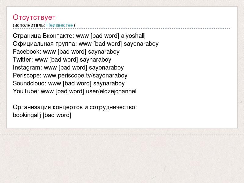 Страница Вконтакте: www [bad word] alyoshallj Официальная группа: www [bad word] sayonaraboy Facebook: www [bad word] saynaraboy Twitter: www [bad word] saynaraboy Instagram: www [bad word] sayonaraboy Periscope: www.periscope.tv/sayonaraboy Soundcloud: www [bad word] saynaraboy YouTube: www [bad word] user/eldzejchannel Организация концертов и сотрудничество: bookingallj [bad word]