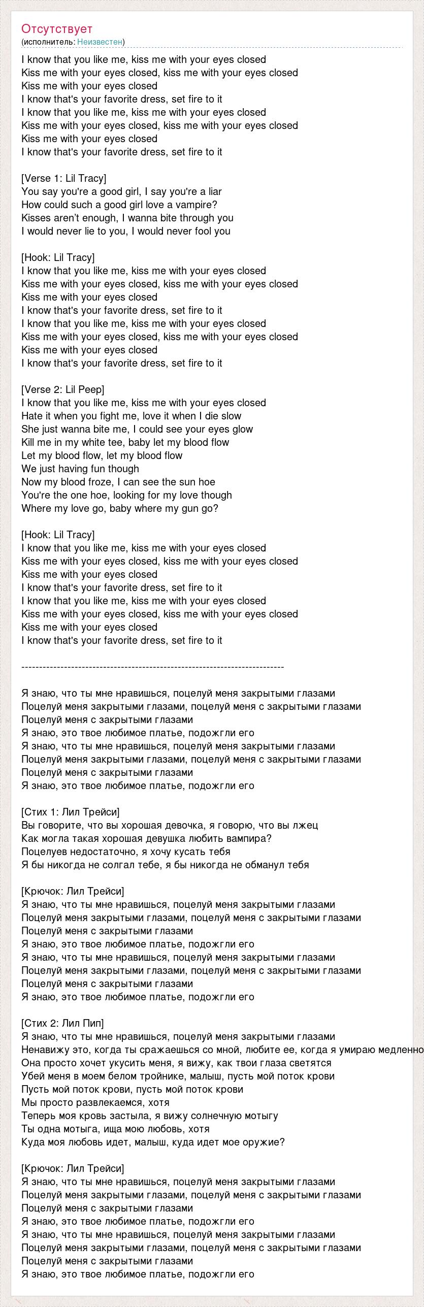 I know that you like me, kiss me with your eyes closed Kiss me with your eyes closed, kiss me with your eyes closed Kiss me with your eyes closed I know that's your favorite dress, set fire to it I know that you like me, kiss me with your eyes closed Kiss me with your eyes closed, kiss me with your eyes closed Kiss me with your eyes closed I know that's your favorite dress, set fire to it [Verse 1: Lil Tracy] You say you're a good girl, I say you're a liar How could such a good girl love a vampire? Kisses aren’t enough, I wanna bite through you I would never lie to you, I would never fool you [Hook: Lil Tracy] I know that you like me, kiss me with your eyes closed Kiss me with your eyes closed, kiss me with your eyes closed Kiss me with your eyes closed I know that's your favorite dress, set fire to it I know that you like me, kiss me with your eyes closed Kiss me with your eyes closed, kiss me with your eyes closed Kiss me with your eyes closed I know that's your favorite dress, set fire to it [Verse 2: Lil Peep] I know that you like me, kiss me with your eyes closed Hate it when you fight me, love it when I die slow She just wanna bite me, I could see your eyes glow Kill me in my white tee, baby let my blood flow Let my blood flow, let my blood flow We just having fun though Now my blood froze, I can see the sun hoe You're the one hoe, looking for my love though Where my love go, baby where my gun go? [Hook: Lil Tracy] I know that you like me, kiss me with your eyes closed Kiss me with your eyes closed, kiss me with your eyes closed Kiss me with your eyes closed I know that's your favorite dress, set fire to it I know that you like me, kiss me with your eyes closed Kiss me with your eyes closed, kiss me with your eyes closed Kiss me with your eyes closed I know that's your favorite dress, set fire to it -------------------------------------------------------------------------- Я знаю, что ты мне нравишься, поцелуй меня закрытыми глазами Поцелуй меня закрытыми глазами, поцелуй меня с закрытыми глазами Поцелуй меня с закрытыми глазами Я знаю, это твое любимое платье, подожгли его Я знаю, что ты мне нравишься, поцелуй меня закрытыми глазами Поцелуй меня закрытыми глазами, поцелуй меня с закрытыми глазами Поцелуй меня с закрытыми глазами Я знаю, это твое любимое платье, подожгли его [Стих 1: Лил Трейси] Вы говорите, что вы хорошая девочка, я говорю, что вы лжец Как могла такая хорошая девушка любить вампира? Поцелуев недостаточно, я хочу кусать тебя Я бы никогда не солгал тебе, я бы никогда не обманул тебя [Крючок: Лил Трейси] Я знаю, что ты мне нравишься, поцелуй меня закрытыми глазами Поцелуй меня закрытыми глазами, поцелуй меня с закрытыми глазами Поцелуй меня с закрытыми глазами Я знаю, это твое любимое платье, подожгли его Я знаю, что ты мне нравишься, поцелуй меня закрытыми глазами Поцелуй меня закрытыми глазами, поцелуй меня с закрытыми глазами Поцелуй меня с закрытыми глазами Я знаю, это твое любимое платье, подожгли его [Стих 2: Лил Пип] Я знаю, что ты мне нравишься, поцелуй меня закрытыми глазами Ненавижу это, когда ты сражаешься со мной, любите ее, когда я умираю медленно Она просто хочет укусить меня, я вижу, как твои глаза светятся Убей меня в моем белом тройнике, малыш, пусть мой поток крови Пусть мой поток крови, пусть мой поток крови Мы просто развлекаемся, хотя Теперь моя кровь застыла, я вижу солнечную мотыгу Ты одна мотыга, ища мою любовь, хотя Куда моя любовь идет, малыш, куда идет мое оружие? [Крючок: Лил Трейси] Я знаю, что ты мне нравишься, поцелуй меня закрытыми глазами Поцелуй меня закрытыми глазами, поцелуй меня с закрытыми глазами Поцелуй меня с закрытыми глазами Я знаю, это твое любимое платье, подожгли его Я знаю, что ты мне нравишься, поцелуй меня закрытыми глазами Поцелуй меня закрытыми глазами, поцелуй меня с закрытыми глазами Поцелуй меня с закрытыми глазами Я знаю, это твое любимое платье, подожгли его