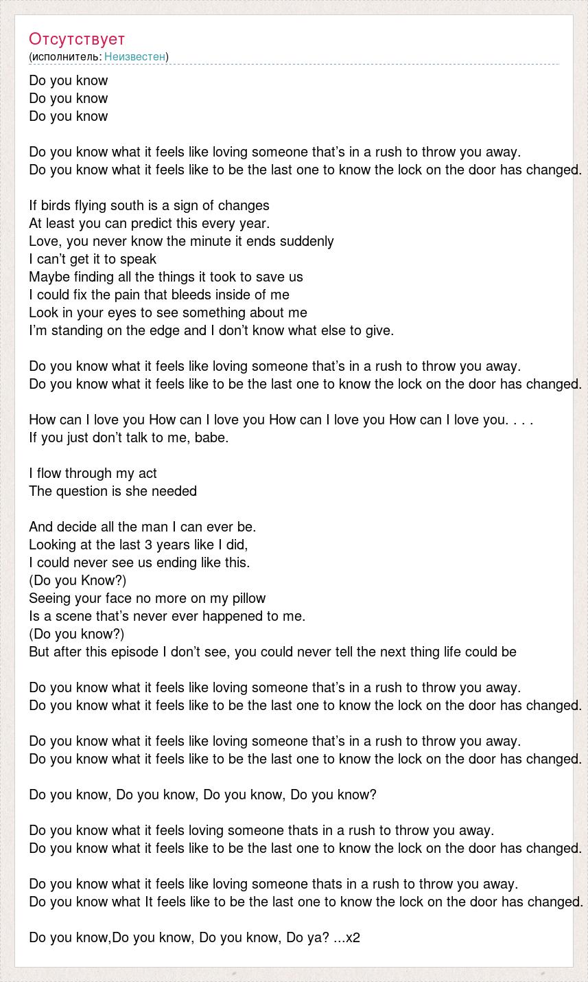 Do you know Do you know Do you know Do you know what it feels like loving someone that’s in a rush to throw you away. Do you know what it feels like to be the last one to know the lock on the door has changed. If birds flying south is a sign of changes At least you can predict this every year. Love, you never know the minute it ends suddenly I can’t get it to speak Maybe finding all the things it took to save us I could fix the pain that bleeds inside of me Look in your eyes to see something about me I’m standing on the edge and I don’t know what else to give. Do you know what it feels like loving someone that’s in a rush to throw you away. Do you know what it feels like to be the last one to know the lock on the door has changed. How can I love you How can I love you How can I love you How can I love you. . . . If you just don’t talk to me, babe. I flow through my act The question is she needed And decide all the man I can ever be. Looking at the last 3 years like I did, I could never see us ending like this. (Do you Know?) Seeing your face no more on my pillow Is a scene that’s never ever happened to me. (Do you know?) But after this episode I don’t see, you could never tell the next thing life could be Do you know what it feels like loving someone that’s in a rush to throw you away. Do you know what it feels like to be the last one to know the lock on the door has changed. Do you know what it feels like loving someone that’s in a rush to throw you away. Do you know what it feels like to be the last one to know the lock on the door has changed. Do you know, Do you know, Do you know, Do you know? Do you know what it feels loving someone thats in a rush to throw you away. Do you know what it feels like to be the last one to know the lock on the door has changed. Do you know what it feels like loving someone thats in a rush to throw you away. Do you know what It feels like to be the last one to know the lock on the door has changed. Do you know,Do you know, Do you know, Do ya? ...x2