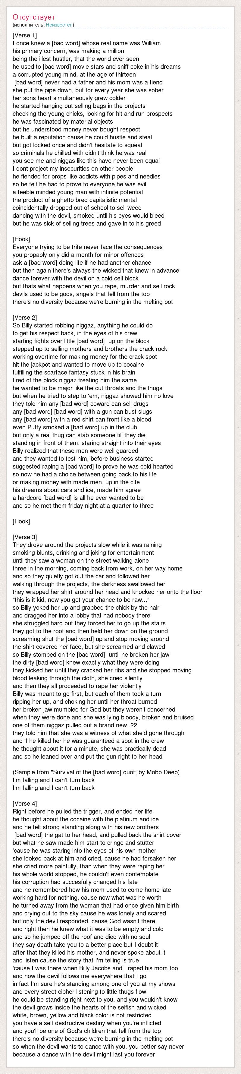 [Verse 1] I once knew a [bad word] whose real name was William his primary concern, was making a million being the illest hustler, that the world ever seen he used to [bad word] movie stars and sniff coke in his dreams a corrupted young mind, at the age of thirteen [bad word] never had a father and his mom was a fiend she put the pipe down, but for every year she was sober her sons heart simultaneously grew colder he started hanging out selling bags in the projects checking the young chicks, looking for hit and run prospects he was fascinated by material objects but he understood money never bought respect he built a reputation cause he could hustle and steal but got locked once and didn't hesitate to squeal so criminals he chilled with didn't think he was real you see me and niggas like this have never been equal I dont project my insecurities on other people he fiended for props like addicts with pipes and needles so he felt he had to prove to everyone he was evil a feeble minded young man with infinite potential the product of a ghetto bred capitalistic mental coincidentally dropped out of school to sell weed dancing with the devil, smoked until his eyes would bleed but he was sick of selling trees and gave in to his greed [Hook] Everyone trying to be trife never face the consequences you propably only did a month for minor offences ask a [bad word] doing life if he had another chance but then again there's always the wicked that knew in advance dance forever with the devil on a cold cell block but thats what happens when you rape, murder and sell rock devils used to be gods, angels that fell from the top there's no diversity because we're burning in the melting pot [Verse 2] So Billy started robbing niggaz, anything he could do to get his respect back, in the eyes of his crew starting fights over little [bad word] up on the block stepped up to selling mothers and brothers the crack rock working overtime for making money for the crack spot hit the jackpot and wanted to move up to cocaine fulfilling the scarface fantasy stuck in his brain tired of the block niggaz treating him the same he wanted to be major like the cut throats and the thugs but when he tried to step to 'em, niggaz showed him no love they told him any [bad word] coward can sell drugs any [bad word] [bad word] with a gun can bust slugs any [bad word] with a red shirt can front like a blood even Puffy smoked a [bad word] up in the club but only a real thug can stab someone till they die standing in front of them, staring straight into their eyes Billy realized that these men were well guarded and they wanted to test him, before business started suggested raping a [bad word] to prove he was cold hearted so now he had a choice between going back to his life or making money with made men, up in the cife his dreams about cars and ice, made him agree a hardcore [bad word] is all he ever wanted to be and so he met them friday night at a quarter to three [Hook] [Verse 3] They drove around the projects slow while it was raining smoking blunts, drinking and joking for entertainment until they saw a woman on the street walking alone three in the morning, coming back from work, on her way home and so they quietly got out the car and followed her walking through the projects, the darkness swallowed her they wrapped her shirt around her head and knocked her onto the floor "this is it kid, now you got your chance to be raw..." so Billy yoked her up and grabbed the chick by the hair and dragged her into a lobby that had nobody there she struggled hard but they forced her to go up the stairs they got to the roof and then held her down on the ground screaming shut the [bad word] up and stop moving around the shirt covered her face, but she screamed and clawed so Billy stomped on the [bad word] until he broken her jaw the dirty [bad word] knew exactly what they were doing they kicked her until they cracked her ribs and she stopped moving blood leaking through the cloth, she cried silently and then they all proceeded to rape her violently Billy was meant to go first, but each of them took a turn ripping her up, and choking her until her throat burned her broken jaw mumbled for God but they weren't concerned when they were done and she was lying bloody, broken and bruised one of them niggaz pulled out a brand new .22 they told him that she was a witness of what she'd gone through and if he killed her he was guaranteed a spot in the crew he thought about it for a minute, she was practically dead and so he leaned over and put the gun right to her head (Sample from "Survival of the [bad word] quot; by Mobb Deep) I'm falling and I can't turn back I'm falling and I can't turn back [Verse 4] Right before he pulled the trigger, and ended her life he thought about the cocaine with the platinum and ice and he felt strong standing along with his new brothers [bad word] the gat to her head, and pulled back the shirt cover but what he saw made him start to cringe and stutter 'cause he was staring into the eyes of his own mother she looked back at him and cried, cause he had forsaken her she cried more painfully, than when they were raping her his whole world stopped, he couldn't even contemplate his corruption had succesfully changed his fate and he remembered how his mom used to come home late working hard for nothing, cause now what was he worth he turned away from the woman that had once given him birth and crying out to the sky cause he was lonely and scared but only the devil responded, cause God wasn't there and right then he knew what it was to be empty and cold and so he jumped off the roof and died with no soul they say death take you to a better place but I doubt it after that they killed his mother, and never spoke about it and listen cause the story that I'm telling is true 'cause I was there when Billy Jacobs and I raped his mom too and now the devil follows me everywhere that I go in fact I'm sure he's standing among one of you at my show