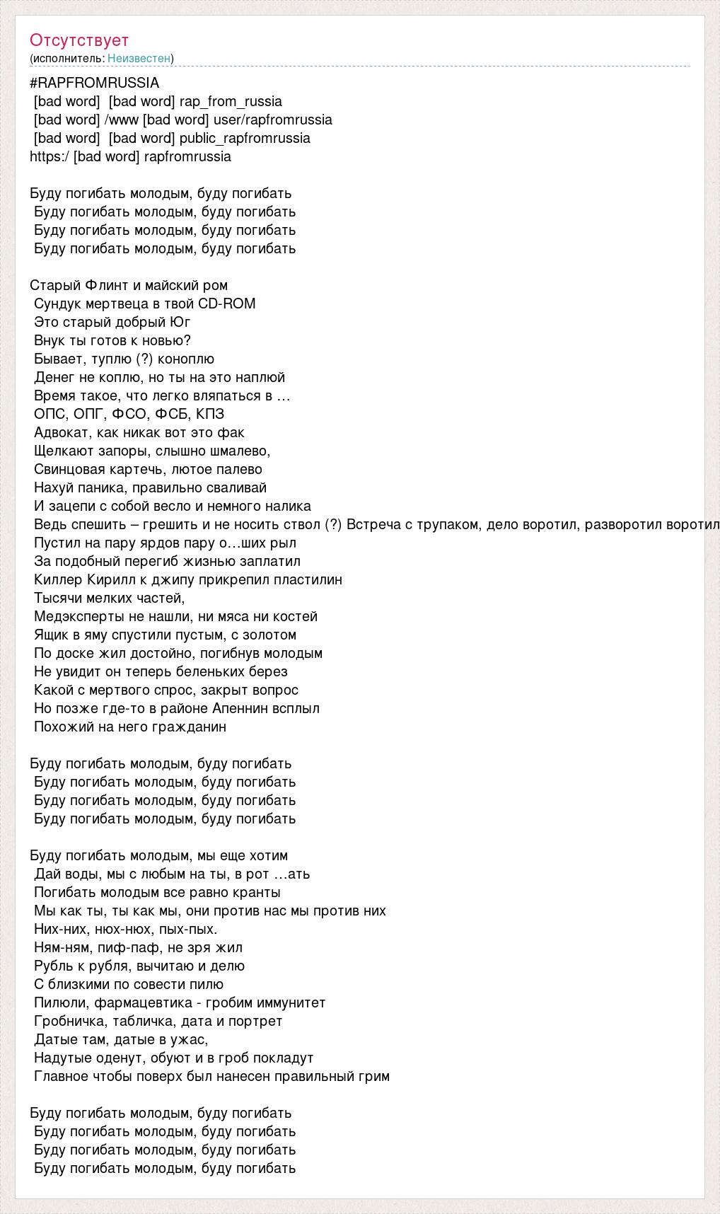 #RAPFROMRUSSIA [bad word] [bad word] rap_from_russia [bad word] /www [bad word] user/rapfromrussia [bad word] [bad word] public_rapfromrussia https:/ [bad word] rapfromrussia Буду погибать молодым, буду погибать Буду погибать молодым, буду погибать Буду погибать молодым, буду погибать Буду погибать молодым, буду погибать Старый Флинт и майский ром Сундук мертвеца в твой CD-ROM Это старый добрый Юг Внук ты готов к новью? Бывает, туплю (?) коноплю Денег не коплю, но ты на это наплюй Время такое, что легко вляпаться в … ОПС, ОПГ, ФСО, ФСБ, КПЗ Адвокат, как никак вот это фак Щелкают запоры, слышно шмалево, Свинцовая картечь, лютое палево Нахуй паника, правильно сваливай И зацепи с собой весло и немного налика Ведь спешить – грешить и не носить ствол (?) Встреча с трупаком, дело воротил, разворотил воротил Пустил на пару ярдов пару о…ших рыл За подобный перегиб жизнью заплатил Киллер Кирилл к джипу прикрепил пластилин Тысячи мелких частей, Медэксперты не нашли, ни мяса ни костей Ящик в яму спустили пустым, с золотом По доске жил достойно, погибнув молодым Не увидит он теперь беленьких берез Какой с мертвого спрос, закрыт вопрос Но позже где-то в районе Апеннин всплыл Похожий на него гражданин Буду погибать молодым, буду погибать Буду погибать молодым, буду погибать Буду погибать молодым, буду погибать Буду погибать молодым, буду погибать Буду погибать молодым, мы еще хотим Дай воды, мы с любым на ты, в рот …ать Погибать молодым все равно кранты Мы как ты, ты как мы, они против нас мы против них Них-них, нюх-нюх, пых-пых. Ням-ням, пиф-паф, не зря жил Рубль к рубля, вычитаю и делю С близкими по совести пилю Пилюли, фармацевтика - гробим иммунитет Гробничка, табличка, дата и портрет Датые там, датые в ужас, Надутые оденут, обуют и в гроб покладут Главное чтобы поверх был нанесен правильный грим Буду погибать молодым, буду погибать Буду погибать молодым, буду погибать Буду погибать молодым, буду погибать Буду погибать молодым, буду погибать