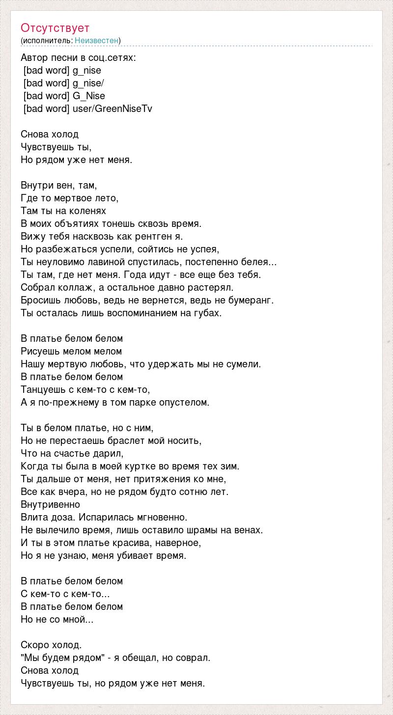 Автор песни в соц.сетях: [bad word] g_nise [bad word] g_nise/ [bad word] G_Nise [bad word] user/GreenNiseTv Снова холод Чувствуешь ты, Но рядом уже нет меня. Внутри вен, там, Где то мертвое лето, Там ты на коленях В моих объятиях тонешь сквозь время. Вижу тебя насквозь как рентген я. Но разбежаться успели, сойтись не успея, Ты неуловимо лавиной спустилась, постепенно белея... Ты там, где нет меня. Года идут - все еще без тебя. Собрал коллаж, а остальное давно растерял. Бросишь любовь, ведь не вернется, ведь не бумеранг. Ты осталась лишь воспоминанием на губах. В платье белом белом Рисуешь мелом мелом Нашу мертвую любовь, что удержать мы не сумели. В платье белом белом Танцуешь с кем-то с кем-то, А я по-прежнему в том парке опустелом. Ты в белом платье, но с ним, Но не перестаешь браслет мой носить, Что на счастье дарил, Когда ты была в моей куртке во время тех зим. Ты дальше от меня, нет притяжения ко мне, Все как вчера, но не рядом будто сотню лет. Внутривенно Влита доза. Испарилась мгновенно. Не вылечило время, лишь оставило шрамы на венах. И ты в этом платье красива, наверное, Но я не узнаю, меня убивает время. В платье белом белом С кем-то с кем-то... В платье белом белом Но не со мной... Скоро холод. "Мы будем рядом" - я обещал, но соврал. Снова холод Чувствуешь ты, но рядом уже нет меня.