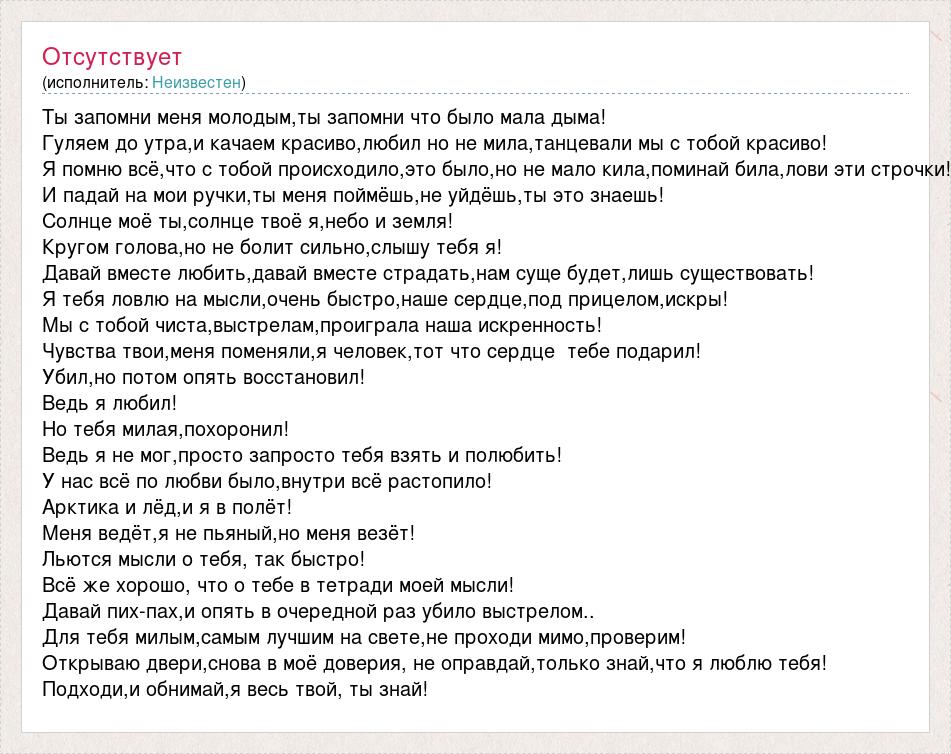 Ты запомни меня молодым,ты запомни что было мала дыма! Гуляем до утра,и качаем красиво,любил но не мила,танцевали мы с тобой красиво! Я помню всё,что с тобой происходило,это было,но не мало кила,поминай била,лови эти строчки! И падай на мои ручки,ты меня поймёшь,не уйдёшь,ты это знаешь! Солнце моё ты,солнце твоё я,небо и земля! Кругом голова,но не болит сильно,слышу тебя я! Давай вместе любить,давай вместе страдать,нам суще будет,лишь существовать! Я тебя ловлю на мысли,очень быстро,наше сердце,под прицелом,искры! Мы с тобой чиста,выстрелам,проиграла наша искренность! Чувства твои,меня поменяли,я человек,тот что сердце тебе подарил! Убил,но потом опять восстановил! Ведь я любил! Но тебя милая,похоронил! Ведь я не мог,просто запросто тебя взять и полюбить! У нас всё по любви было,внутри всё растопило! Арктика и лёд,и я в полёт! Меня ведёт,я не пьяный,но меня везёт! Льются мысли о тебя, так быстро! Всё же хорошо, что о тебе в тетради моей мысли! Давай пих-пах,и опять в очередной раз убило выстрелом.. Для тебя милым,самым лучшим на свете,не проходи мимо,проверим! Открываю двери,снова в моё доверия, не оправдай,только знай,что я люблю тебя! Подходи,и обнимай,я весь твой, ты знай!