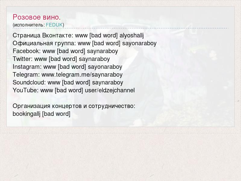 Страница Вконтакте: www [bad word] alyoshallj Официальная группа: www [bad word] sayonaraboy Facebook: www [bad word] saynaraboy Twitter: www [bad word] saynaraboy Instagram: www [bad word] sayonaraboy Telegram: www.telegram.me/saynaraboy Soundcloud: www [bad word] saynaraboy YouTube: www [bad word] user/eldzejchannel Организация концертов и сотрудничество: bookingallj [bad word]