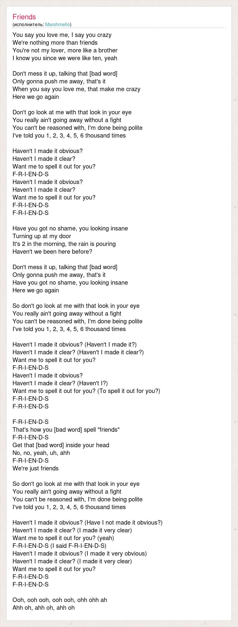 You say you love me, I say you crazy We're nothing more than friends You're not my lover, more like a brother I know you since we were like ten, yeah Don't mess it up, talking that [bad word] Only gonna push me away, that's it When you say you love me, that make me crazy Here we go again Don't go look at me with that look in your eye You really ain't going away without a fight You can't be reasoned with, I'm done being polite I've told you 1, 2, 3, 4, 5, 6 thousand times Haven't I made it obvious? Haven't I made it clear? Want me to spell it out for you? F-R-I-EN-D-S Haven't I made it obvious? Haven't I made it clear? Want me to spell it out for you? F-R-I-EN-D-S F-R-I-EN-D-S Have you got no shame, you looking insane Turning up at my door It's 2 in the morning, the rain is pouring Haven't we been here before? Don't mess it up, talking that [bad word] Only gonna push me away, that's it Have you got no shame, you looking insane Here we go again So don't go look at me with that look in your eye You really ain't going away without a fight You can't be reasoned with, I'm done being polite I've told you 1, 2, 3, 4, 5, 6 thousand times Haven't I made it obvious? (Haven't I made it?) Haven't I made it clear? (Haven't I made it clear?) Want me to spell it out for you? F-R-I-EN-D-S Haven't I made it obvious? Haven't I made it clear? (Haven't I?) Want me to spell it out for you? (To spell it out for you?) F-R-I-EN-D-S F-R-I-EN-D-S F-R-I-EN-D-S That's how you [bad word] spell "friends" F-R-I-EN-D-S Get that [bad word] inside your head No, no, yeah, uh, ahh F-R-I-EN-D-S We're just friends So don't go look at me with that look in your eye You really ain't going away without a fight You can't be reasoned with, I'm done being polite I've told you 1, 2, 3, 4, 5, 6 thousand times Haven't I made it obvious? (Have I not made it obvious?) Haven't I made it clear? (I made it very clear) Want me to spell it out for you? (yeah) F-R-I-EN-D-S (I said F-R-I-EN-D-S) Haven't I made it obvious? (I made it very obvious) Haven't I made it clear? (I made it very clear) Want me to spell it out for you? F-R-I-EN-D-S F-R-I-EN-D-S Ooh, ooh ooh, ooh ooh, ohh ohh ah Ahh oh, ahh oh, ahh oh