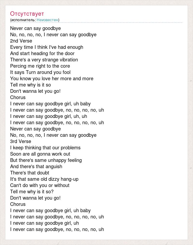 Never can say goodbye No, no, no, no, I never can say goodbye 2nd Verse Every time I think I've had enough And start heading for the door There's a very strange vibration Percing me right to the core It says Turn around you fool You know you love her more and more Tell me why is it so Don't wanna let you go! Chorus I never can say goodbye girl, uh baby I never can say goodbye, no, no, no, no, uh I never can say goodbye girl, uh, uh I never can say goodbye, no, no, no, no, uh Never can say goodbye No, no, no, no, I never can say goodbye 3rd Verse I keep thinking that our problems Soon are all gonna work out But there's same unhappy feeling And there's that anguish There's that doubt It's that same old dizzy hang-up Can't do with you or without Tell me why is it so? Don't wanna let you go! Chorus I never can say goodbye girl, uh baby I never can say goodbye, no, no, no, no, uh I never can say goodbye girl, uh I never can say goodbye, no, no, no, no, uh