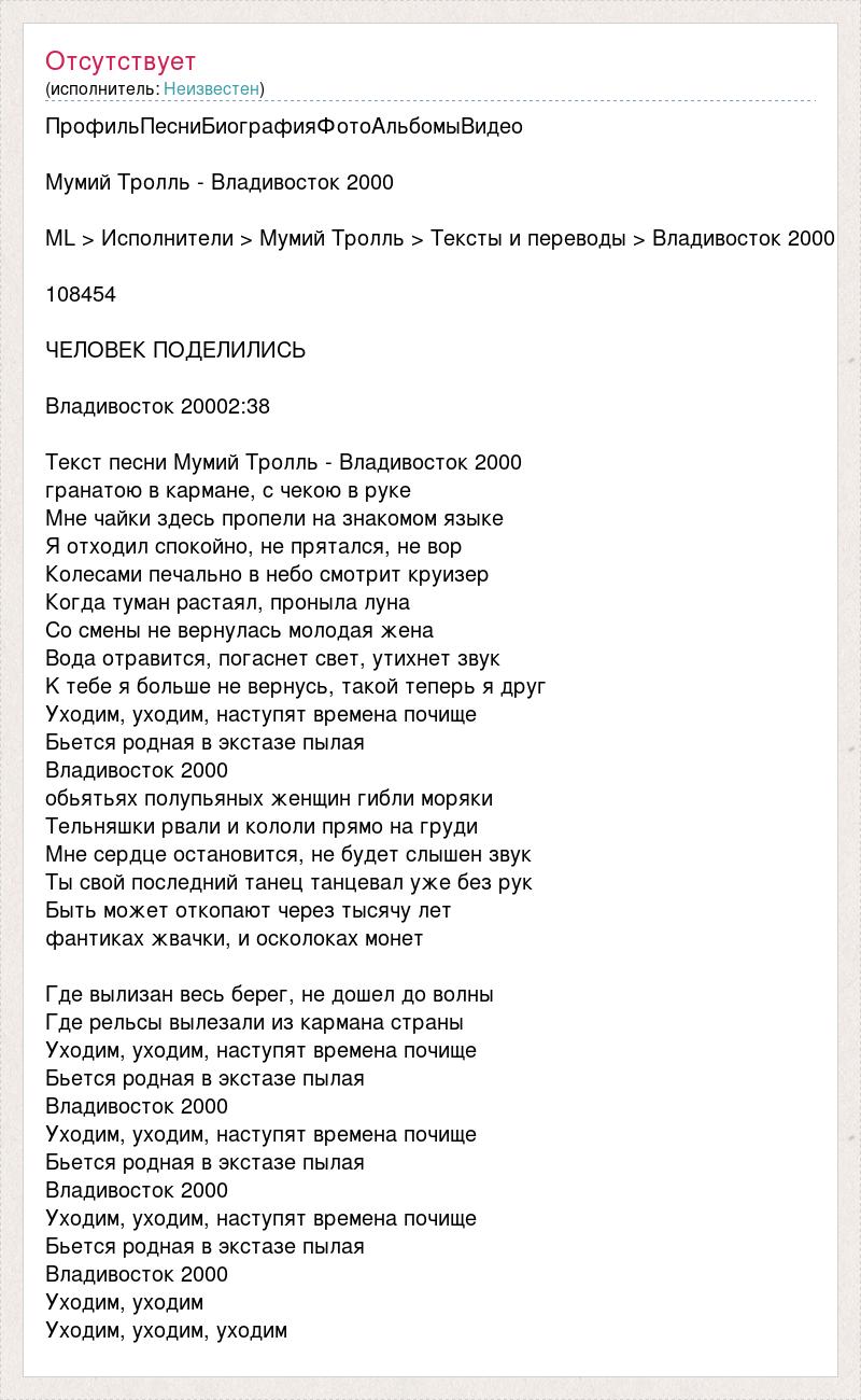 ПрофильПесниБиографияФотоАльбомыВидео Мумий Тролль - Владивосток 2000 ML > Исполнители > Мумий Тролль > Тексты и переводы > Владивосток 2000 108454 ЧЕЛОВЕК ПОДЕЛИЛИСЬ Владивосток 20002:38 Текст песни Мумий Тролль - Владивосток 2000 гранатою в кармане, c чекою в руке Мне чайки здесь пропели на знакомом языке Я отходил спокойно, не прятался, не воp Колесами печально в небо смотрит круизеp Когда туман paстаял, проныла луна Co смены не вернулась молодая жена Вода отравится, погаснет свет, утихнет звук K тебе я больше не вернусь, такой теперь я друг Уходим, уходим, наступят времена почище Бьется pодная в экстазе пылая Владивосток 2000 обьятьях полупьяных женщин гибли моряки Тельняшки рвали и кололи прямо на груди Мне сердце остановится, не будет слышен звук Ты свой последний танец танцевал уже без рук Быть может откопают чеpез тысячу лет фантиках жвачки, и осколоках монет Где вылизан весь беpег, не дошел до волны Где pельсы вылезали из кармана страны Уходим, уходим, наступят времена почище Бьется pодная в экстазе пылая Владивосток 2000 Уходим, уходим, наступят времена почище Бьется pодная в экстазе пылая Владивосток 2000 Уходим, уходим, наступят времена почище Бьется pодная в экстазе пылая Владивосток 2000 Уходим, уходим Уходим, уходим, уходим