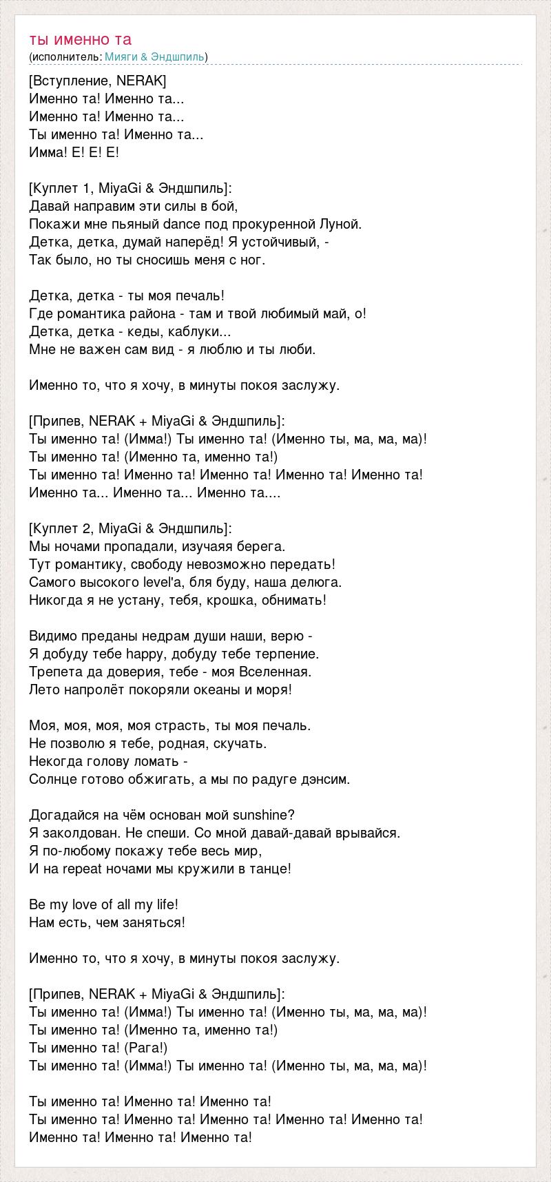 [Вступление, NERAK] Именно та! Именно та... Именно та! Именно та... Ты именно та! Именно та... Имма! Е! Е! Е! [Куплет 1, MiyaGi & Эндшпиль]: Давай направим эти силы в бой, Покажи мне пьяный dаnce под прокуренной Луной. Детка, детка, думай наперёд! Я устойчивый, - Так было, но ты сносишь меня с ног. Детка, детка - ты моя печаль! Где романтика района - там и твой любимый май, о! Детка, детка - кеды, каблуки... Мне не важен сам вид - я люблю и ты люби. Именно то, что я хочу, в минуты покоя заслужу. [Припев, NERAK + MiyaGi & Эндшпиль]: Ты именно та! (Имма!) Ты именно та! (Именно ты, ма, ма, ма)! Ты именно та! (Именно та, именно та!) Ты именно та! Именно та! Именно та! Именно та! Именно та! Именно та... Именно та... Именно та.... [Куплет 2, MiyaGi & Эндшпиль]: Мы ночами пропадали, изучаяя берега. Тут романтику, свободу невозможно передать! Самого высокого level'а, бля буду, наша делюга. Никогда я не устану, тебя, крошка, обнимать! Видимо преданы недрам души наши, верю - Я добуду тебе happy, добуду тебе терпение. Трепета да доверия, тебе - моя Вселенная. Лето напролёт покоряли океаны и моря! Моя, моя, моя, моя страсть, ты моя печаль. Не позволю я тебе, родная, скучать. Некогда голову ломать - Солнце готово обжигать, а мы по радуге дэнсим. Догадайся на чём основан мой sunshine? Я заколдован. Не спеши. Со мной давай-давай врывайся. Я по-любому покажу тебе весь мир, И на repeat ночами мы кружили в танце! Be my love of all my life! Нам есть, чем заняться! Именно то, что я хочу, в минуты покоя заслужу. [Припев, NERAK + MiyaGi & Эндшпиль]: Ты именно та! (Имма!) Ты именно та! (Именно ты, ма, ма, ма)! Ты именно та! (Именно та, именно та!) Ты именно та! (Рага!) Ты именно та! (Имма!) Ты именно та! (Именно ты, ма, ма, ма)! Ты именно та! Именно та! Именно та! Ты именно та! Именно та! Именно та! Именно та! Именно та! Именно та! Именно та! Именно та!
