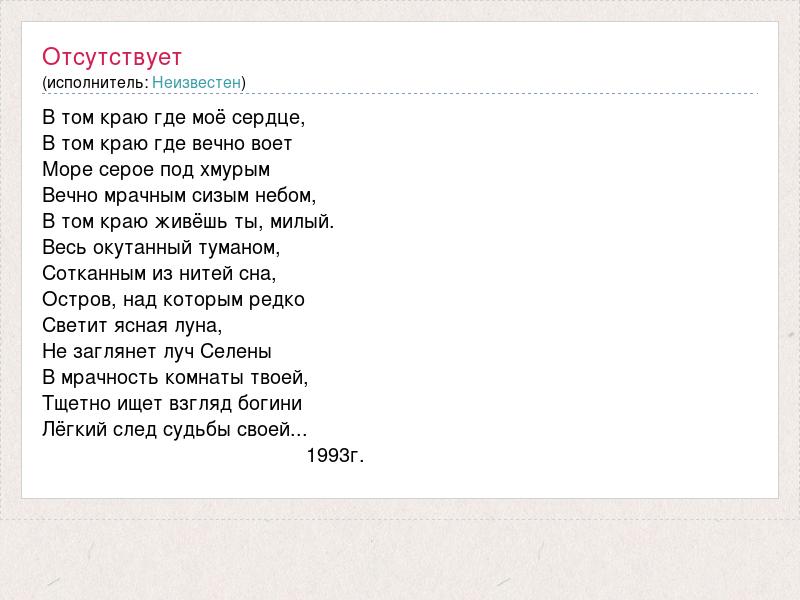 А как ты думаешь, о чем песня "В том краю где моё сердце" ?