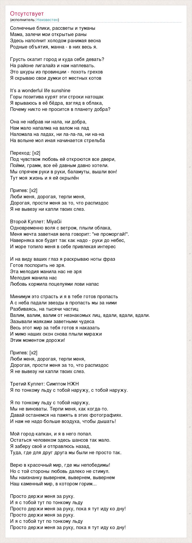 Солнечные блики, рассветы и туманы Мама, залечи мои открытые раны Здесь наполнит холодом ранимая весна Родные объятия, манна - в них весь я. Грусть окатит город и куда себя девать? На районе лигалайз и нам наплевать. Это шкуры из провинции - похоть грехов Я скрываю свои думки от местных котов It’s a wonderful life sunshine Горы позитива курят эти строки натощак Я врываюсь в её бёдра, взгляд в облака, Почему никто не просится в планету добра? Она не набрав ни нала, ни добра, Нам мало напалма на валом на лад Наломала на ладах, ни ла-ла-ла, ни на-на На волыне мол иная начинается стрельба Переход: [х2] Под чувством любовь ей откроются все двери, Пойми, грамм, все её давным давно хотели. Мы спрячем руки в руки, баламуты, вышли вон! Тут моя жизнь и я ей окрылён Припев: [х2] Люби меня, дорогая, терпи меня, Дорогая, прости меня за то, что распиздос Я не вывезу ни капли твоих слез. Второй Куплет: MiyaGi Одновременно воля с ветром, плыли облака, Меня мечта заветная вела говорит: "не проморгай!". Наверняка все будет так как надо - руки до небес, И море топило меня в себе привлекая интерес И на виду ваших глаз я раскрываю ноты фраз Готов поспорить не зря. Эта мелодия манила нас не зря Мелодия манила нас Любовь кормила поцелуями лови напас Минимум это страсть и я в тебе готов пропасть А с неба падали звезды в пропасть мы за ними Разбиваясь, на тысячи частиц Валим, валим, валим от незнакомых лиц, вдали, вдали, вдали. Зазывали маяками заветными чудеса Весь этот мир за тебя готов я наказать И мимо наших окон снова плыли миражи Этим моментом дорожи! Припев: [х2] Люби меня, дорогая, терпи меня, Дорогая, прости меня за то, что распиздос Я не вывезу ни капли твоих слез. Третий Куплет: Симптом НЖН Я по тонкому льду с тобой наружу, с тобой наружу. Я по тонкому льду с тобой наружу, Мы не виноваты. Терпи меня, как когда-то. Давай останемся на память в этих фотографиях. И нам не надо больше воздуха, чтобы дышать! Мой город-капкан, и я в него попал. Остаться человеком здесь шансов так мало. Я заберу своё и отправлюсь назад, Туда, где для друг друга мы были не просто так. Верю в красочный мир, где мы непобедимы! Но с той стороны любовь далеко не стимул. Мы наизнанку вывернем, вывернем, вывернем Наш каменный мир, в котором горим... Просто держи меня за руку. И я с тобой тут по тонкому льду Просто держи меня за руку, пока я тут иду ко дну! Просто держи меня за руку. И я с тобой тут по тонкому льду Просто держи меня за руку, пока я тут иду ко дну!