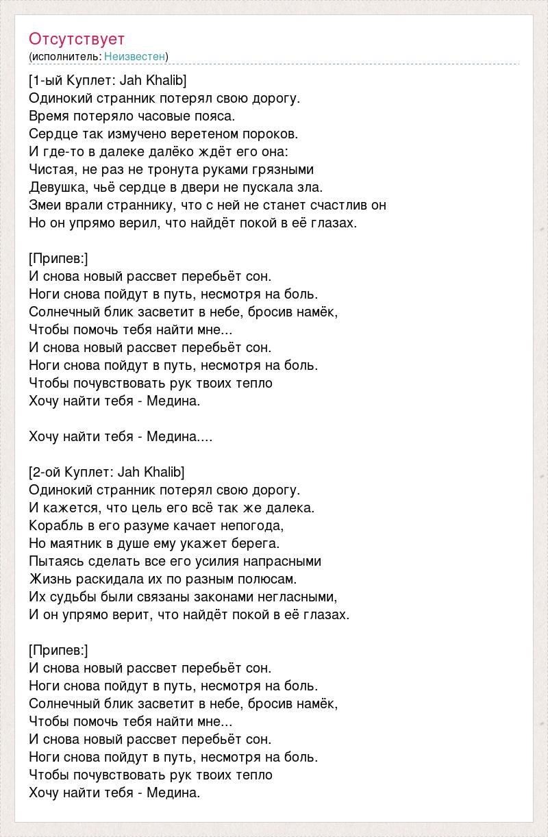 [1-ый Куплет: Jah Khalib] Одинокий странник потерял свою дорогу. Время потеряло часовые пояса. Сердце так измучено веретеном пороков. И где-то в далеке далёко ждёт его она: Чистая, не раз не тронута руками грязными Девушка, чьё сердце в двери не пускала зла. Змеи врали страннику, что с ней не станет счастлив он Но он упрямо верил, что найдёт покой в её глазах. [Припев:] И снова новый рассвет перебьёт сон. Ноги снова пойдут в путь, несмотря на боль. Солнечный блик засветит в небе, бросив намёк, Чтобы помочь тебя найти мне... И снова новый рассвет перебьёт сон. Ноги снова пойдут в путь, несмотря на боль. Чтобы почувствовать рук твоих тепло Хочу найти тебя - Медина. Хочу найти тебя - Медина.... [2-ой Куплет: Jah Khalib] Одинокий странник потерял свою дорогу. И кажется, что цель его всё так же далека. Корабль в его разуме качает непогода, Но маятник в душе ему укажет берега. Пытаясь сделать все его усилия напрасными Жизнь раскидала их по разным полюсам. Их судьбы были связаны законами негласными, И он упрямо верит, что найдёт покой в её глазах. [Припев:] И снова новый рассвет перебьёт сон. Ноги снова пойдут в путь, несмотря на боль. Солнечный блик засветит в небе, бросив намёк, Чтобы помочь тебя найти мне... И снова новый рассвет перебьёт сон. Ноги снова пойдут в путь, несмотря на боль. Чтобы почувствовать рук твоих тепло Хочу найти тебя - Медина.