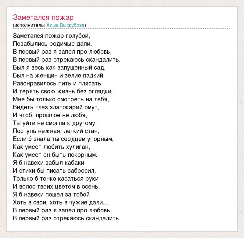 Заметался пожар голубой, Позабылись родимые дали. В первый раз я запел про любовь, В первый раз отрекаюсь скандалить. Был я весь как запущенный сад, Был на женщин и зелие падкий. Разонравилось пить и плясать И терять свою жизнь без оглядки. Мне бы только смотреть на тебя, Видеть глаз златокарий омут, И чтоб, прошлое не любя, Ты уйти не смогла к другому. Поступь нежная, легкий стан, Если б знала ты сердцем упорным, Как умеет любить хулиган, Как умеет он быть покорным. Я б навеки забыл кабаки И стихи бы писать забросил, Только б тонко касаться руки И волос твоих цветом в осень. Я б навеки пошел за тобой Хоть в свои, хоть в чужие дали... В первый раз я запел про любовь, В первый раз отрекаюсь скандалить.