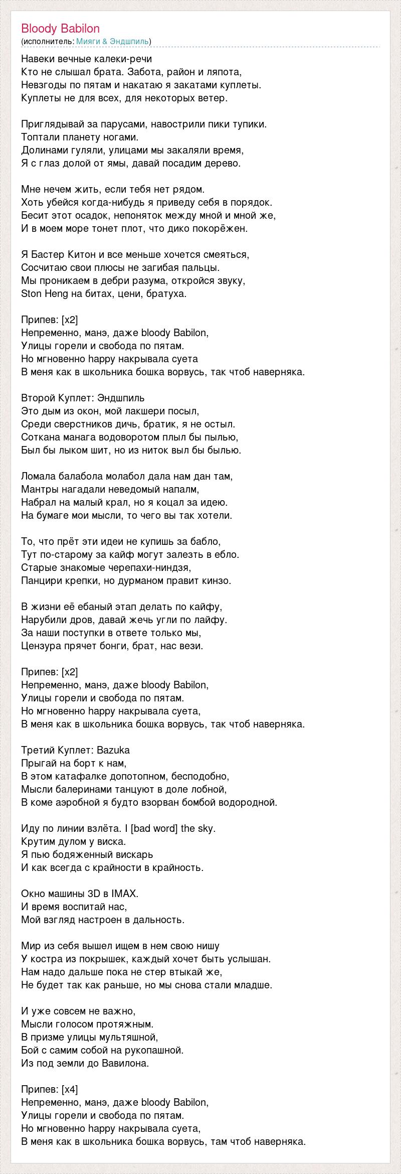 Навеки вечные калеки-речи Кто не слышал брата. Забота, район и ляпота, Невзгоды по пятам и накатаю я закатами куплеты. Куплеты не для всех, для некоторых ветер. Приглядывай за парусами, навострили пики тупики. Топтали планету ногами. Долинами гуляли, улицами мы закаляли время, Я с глаз долой от ямы, давай посадим дерево. Мне нечем жить, если тебя нет рядом. Хоть убейся когда-нибудь я приведу себя в порядок. Бесит этот осадок, непоняток между мной и мной же, И в моем море тонет плот, что дико покорёжен. Я Бастер Китон и все меньше хочется смеяться, Сосчитаю свои плюсы не загибая пальцы. Мы проникаем в дебри разума, откройся звуку, Ston Heng на битах, цени, братуха. Припев: [х2] Непременно, манэ, даже bloody Babilon, Улицы горели и свобода по пятам. Но мгновенно happy накрывала суета В меня как в школьника бошка ворвусь, так чтоб наверняка. Второй Куплет: Эндшпиль Это дым из окон, мой лакшери посыл, Среди сверстников дичь, братик, я не остыл. Соткана манага водоворотом плыл бы пылью, Был бы лыком шит, но из ниток выл бы былью. Ломала балабола молабол дала нам дан там, Мантры нагадали неведомый напалм, Набрал на малый крал, но я коцал за идею. На бумаге мои мысли, то чего вы так хотели. То, что прёт эти идеи не купишь за бабло, Тут по-старому за кайф могут залезть в ебло. Старые знакомые черепахи-ниндзя, Панцири крепки, но дурманом правит кинзо. В жизни её ебаный этап делать по кайфу, Нарубили дров, давай жечь угли по лайфу. За наши поступки в ответе только мы, Цензура прячет бонги, брат, нас вези. Припев: [х2] Непременно, манэ, даже bloody Babilon, Улицы горели и свобода по пятам. Но мгновенно happy накрывала суета, В меня как в школьника бошка ворвусь, так чтоб наверняка. Третий Куплет: Bazuka Прыгай на борт к нам, В этом катафалке допотопном, бесподобно, Мысли балеринами танцуют в доле лобной, В коме аэробной я будто взорван бомбой водородной. Иду по линии взлёта. I [bad word] the sky. Крутим дулом у виска. Я пью бодяженный вискарь И как всегда с крайности в крайность. Окно машины 3D в IMAX. И время воспитай нас, Мой взгляд настроен в дальность. Мир из себя вышел ищем в нем свою нишу У костра из покрышек, каждый хочет быть услышан. Нам надо дальше пока не стер втыкай же, Не будет так как раньше, но мы снова стали младше. И уже совсем не важно, Мысли голосом протяжным. В призме улицы мультяшной, Бой с самим собой на рукопашной. Из под земли до Вавилона. Припев: [х4] Непременно, манэ, даже bloody Babilon, Улицы горели и свобода по пятам. Но мгновенно happy накрывала суета, В меня как в школьника бошка ворвусь, там чтоб наверняка.