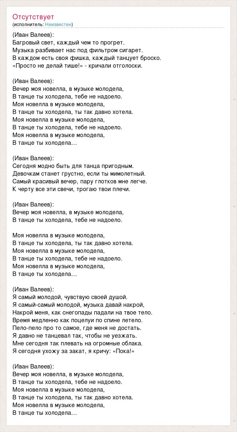 (Иван Валеев): Багровый свет, каждый чем то прогрет. Музыка разбивает нас под фильтром сигарет. В каждом есть своя фишка, каждый танцует броско. «Просто не делай тише!» - кричали отголоски. (Иван Валеев): Вечер моя новелла, в музыке молодела, В танце ты холодела, тебе не надоело. Моя новелла в музыке молодела, В танце ты холодела, ты так давно хотела. Моя новелла в музыке молодела, В танце ты холодела, тебе не надоело. Моя новелла в музыке молодела, В танце ты холодела… (Иван Валеев): Сегодня модно быть для танца пригодным. Девочкам станет грустно, если ты мимолетный. Самый красивый вечер, пару глотков мне легче. К черту все эти свечи, трогаю твои плечи. (Иван Валеев): Вечер моя новелла, в музыке молодела, В танце ты холодела, тебе не надоело. Моя новелла в музыке молодела, В танце ты холодела, ты так давно хотела. Моя новелла в музыке молодела, В танце ты холодела, тебе не надоело. Моя новелла в музыке молодела, В танце ты холодела… (Иван Валеев): Я самый молодой, чувствую своей душой. Я самый-самый молодой, музыка давай накрой, Накрой меня, как снегопады падали на твое тело. Время медленно как поцелуи по спине летело. Пело-пело про то самое, где меня не достать. Я давно не танцевал так, чтобы не уезжать. Мне сегодня так плевать на огромные облака. Я сегодня ухожу за закат, я кричу: «Пока!» (Иван Валеев): Вечер моя новелла, в музыке молодела, В танце ты холодела, тебе не надоело. Моя новелла в музыке молодела, В танце ты холодела, ты так давно хотела. Моя новелла в музыке молодела, В танце ты холодела…