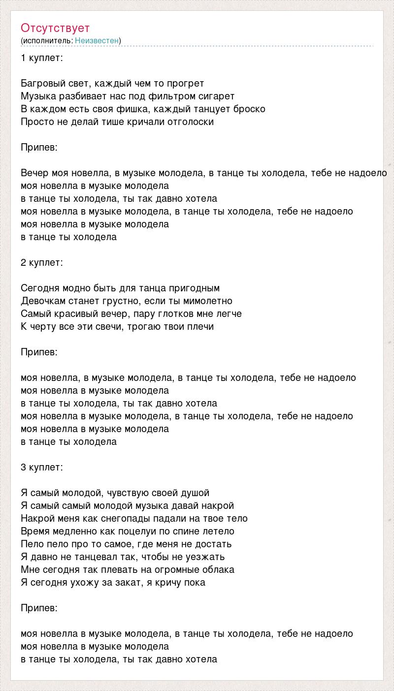 1 куплет: Багровый свет, каждый чем то прогрет Музыка разбивает нас под фильтром сигарет В каждом есть своя фишка, каждый танцует броско Просто не делай тише кричали отголоски Припев: Вечер моя новелла, в музыке молодела, в танце ты холодела, тебе не надоело моя новелла в музыке молодела в танце ты холодела, ты так давно хотела моя новелла в музыке молодела, в танце ты холодела, тебе не надоело моя новелла в музыке молодела в танце ты холодела 2 куплет: Сегодня модно быть для танца пригодным Девочкам станет грустно, если ты мимолетно Самый красивый вечер, пару глотков мне легче К черту все эти свечи, трогаю твои плечи Припев: моя новелла, в музыке молодела, в танце ты холодела, тебе не надоело моя новелла в музыке молодела в танце ты холодела, ты так давно хотела моя новелла в музыке молодела, в танце ты холодела, тебе не надоело моя новелла в музыке молодела в танце ты холодела 3 куплет: Я самый молодой, чувствую своей душой Я самый самый молодой музыка давай накрой Накрой меня как снегопады падали на твое тело Время медленно как поцелуи по спине летело Пело пело про то самое, где меня не достать Я давно не танцевал так, чтобы не уезжать Мне сегодня так плевать на огромные облака Я сегодня ухожу за закат, я кричу пока Припев: моя новелла в музыке молодела, в танце ты холодела, тебе не надоело моя новелла в музыке молодела в танце ты холодела, ты так давно хотела