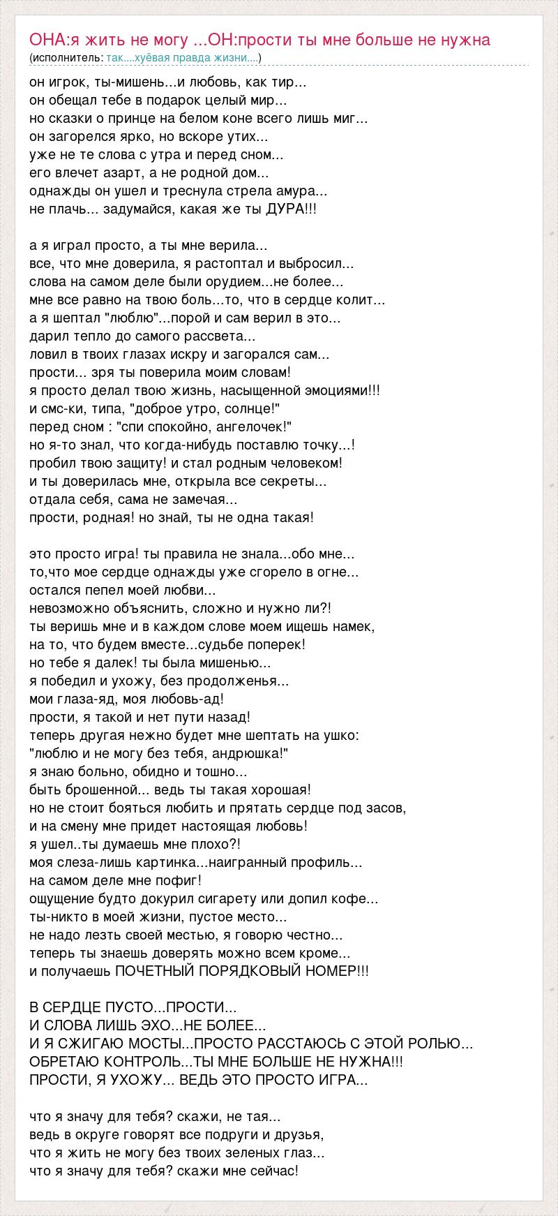 он игрок, ты-мишень...и любовь, как тир... он обещал тебе в подарок целый мир... но сказки о принце на белом коне всего лишь миг... он загорелся ярко, но вскоре утих... уже не те слова с утра и перед сном... его влечет азарт, а не родной дом... однажды он ушел и треснула стрела амура... не плачь... задумайся, какая же ты ДУРА!!! а я играл просто, а ты мне верила... все, что мне доверила, я растоптал и выбросил... слова на самом деле были орудием...не более... мне все равно на твою боль...то, что в сердце колит... а я шептал "люблю"...порой и сам верил в это... дарил тепло до самого рассвета... ловил в твоих глазах искру и загорался сам... прости... зря ты поверила моим словам! я просто делал твою жизнь, насыщенной эмоциями!!! и смс-ки, типа, "доброе утро, солнце!" перед сном : "спи спокойно, ангелочек!" но я-то знал, что когда-нибудь поставлю точку...! пробил твою защиту! и стал родным человеком! и ты доверилась мне, открыла все секреты... отдала себя, сама не замечая... прости, родная! но знай, ты не одна такая! это просто игра! ты правила не знала...обо мне... то,что мое сердце однажды уже сгорело в огне... остался пепел моей любви... невозможно объяснить, сложно и нужно ли?! ты веришь мне и в каждом слове моем ищешь намек, на то, что будем вместе...судьбе поперек! но тебе я далек! ты была мишенью... я победил и ухожу, без продолженья... мои глаза-яд, моя любовь-ад! прости, я такой и нет пути назад! теперь другая нежно будет мне шептать на ушко: "люблю и не могу без тебя, андрюшка!" я знаю больно, обидно и тошно... быть брошенной... ведь ты такая хорошая! но не стоит бояться любить и прятать сердце под засов, и на смену мне придет настоящая любовь! я ушел..ты думаешь мне плохо?! моя слеза-лишь картинка...наигранный профиль... на самом деле мне пофиг! ощущение будто докурил сигарету или допил кофе... ты-никто в моей жизни, пустое место... не надо лезть своей местью, я говорю честно... теперь ты знаешь доверять можно всем кроме... и получаешь ПОЧЕТНЫЙ ПОРЯДКОВЫЙ НОМЕР!!! В СЕРДЦЕ ПУСТО...ПРОСТИ... И СЛОВА ЛИШЬ ЭХО...НЕ БОЛЕЕ... И Я СЖИГАЮ МОСТЫ...ПРОСТО РАССТАЮСЬ С ЭТОЙ РОЛЬЮ... ОБРЕТАЮ КОНТРОЛЬ...ТЫ МНЕ БОЛЬШЕ НЕ НУЖНА!!! ПРОСТИ, Я УХОЖУ... ВЕДЬ ЭТО ПРОСТО ИГРА... что я значу для тебя? скажи, не тая... ведь в округе говорят все подруги и друзья, что я жить не могу без твоих зеленых глаз... что я значу для тебя? скажи мне сейчас!