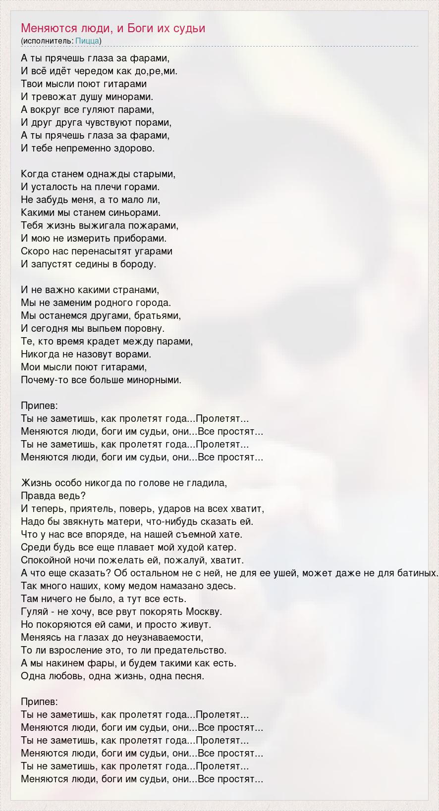 А ты прячешь глаза за фарами, И всё идёт чередом как до,ре,ми. Твои мысли поют гитарами И тревожат душу минорами. А вокруг все гуляют парами, И друг друга чувствуют порами, А ты прячешь глаза за фарами, И тебе непременно здорово. Когда станем однажды старыми, И усталость на плечи горами. Не забудь меня, а то мало ли, Какими мы станем синьорами. Тебя жизнь выжигала пожарами, И мою не измерить приборами. Скоро нас перенасытят угарами И запустят седины в бороду. И не важно какими странами, Мы не заменим родного города. Мы останемся другами, братьями, И сегодня мы выпьем поровну. Те, кто время крадет между парами, Никогда не назовут ворами. Мои мысли поют гитарами, Почему-то все больше минорными. Припев: Ты не заметишь, как пролетят года...Пролетят... Меняются люди, боги им судьи, они...Все простят... Ты не заметишь, как пролетят года...Пролетят... Меняются люди, боги им судьи, они...Все простят... Жизнь особо никогда по голове не гладила, Правда ведь? И теперь, приятель, поверь, ударов на всех хватит, Надо бы звякнуть матери, что-нибудь сказать ей. Что у нас все впоряде, на нашей съемной хате. Среди будь все еще плавает мой худой катер. Спокойной ночи пожелать ей, пожалуй, хватит. А что еще сказать? Об остальном не с ней, не для ее ушей, может даже не для батиных. Так много наших, кому медом намазано здесь. Там ничего не было, а тут все есть. Гуляй - не хочу, все рвут покорять Москву. Но покоряются ей сами, и просто живут. Меняясь на глазах до неузнаваемости, То ли взросление это, то ли предательство. А мы накинем фары, и будем такими как есть. Одна любовь, одна жизнь, одна песня. Припев: Ты не заметишь, как пролетят года...Пролетят... Меняются люди, боги им судьи, они...Все простят... Ты не заметишь, как пролетят года...Пролетят... Меняются люди, боги им судьи, они...Все простят... Ты не заметишь, как пролетят года...Пролетят... Меняются люди, боги им судьи, они...Все простят...