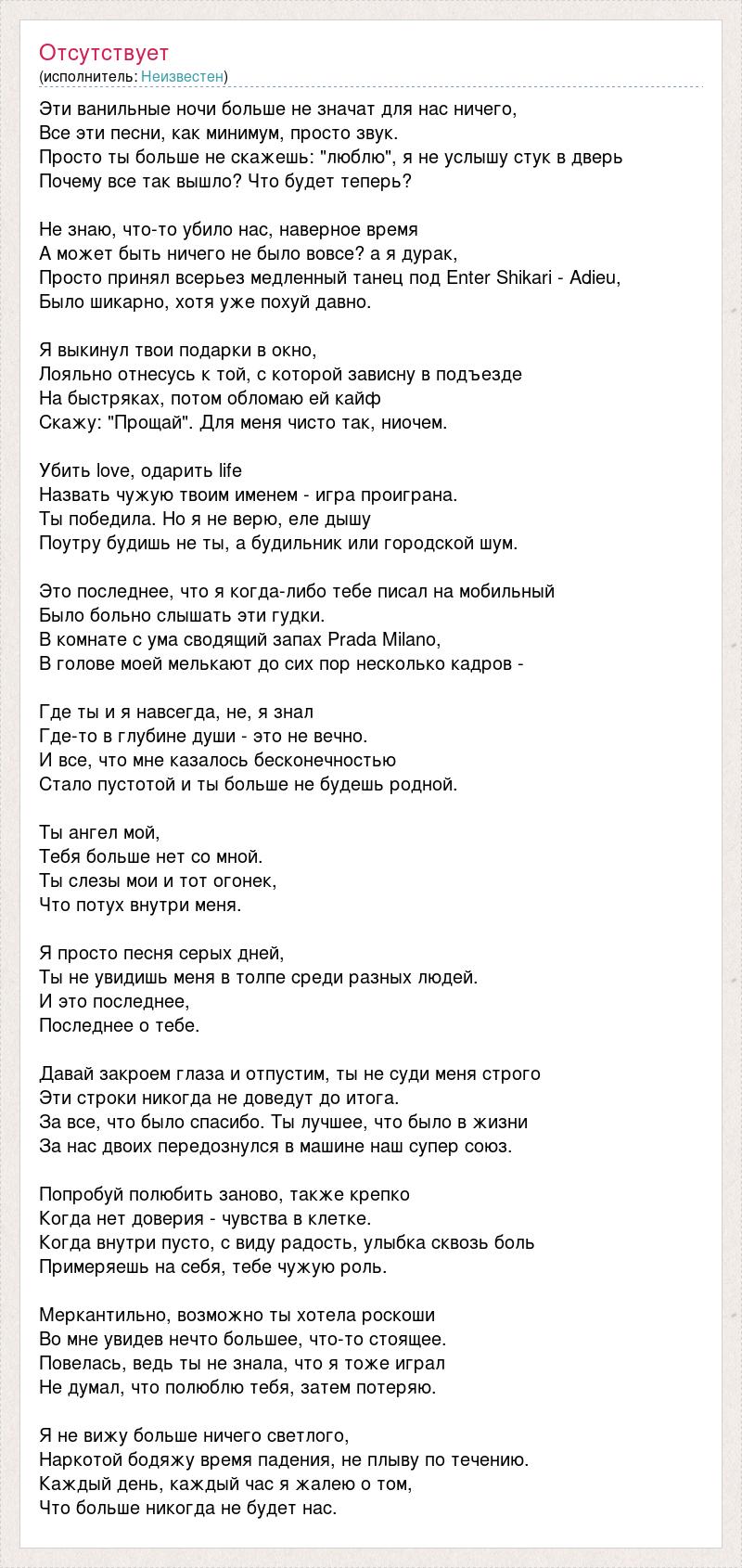 Эти ванильные ночи больше не значат для нас ничего, Все эти песни, как минимум, просто звук. Просто ты больше не скажешь: "люблю", я не услышу стук в дверь Почему все так вышло? Что будет теперь? Не знаю, что-то убило нас, наверное время А может быть ничего не было вовсе? а я дурак, Просто принял всерьез медленный танец под Enter Shikari - Adieu, Было шикарно, хотя уже похуй давно. Я выкинул твои подарки в окно, Лояльно отнесусь к той, с которой зависну в подъезде На быстряках, потом обломаю ей кайф Скажу: "Прощай". Для меня чисто так, ниочем. Убить love, одарить life Назвать чужую твоим именем - игра проиграна. Ты победила. Но я не верю, еле дышу Поутру будишь не ты, а будильник или городской шум. Это последнее, что я когда-либо тебе писал на мобильный Было больно слышать эти гудки. В комнате с ума сводящий запах Prada Milano, В голове моей мелькают до сих пор несколько кадров - Где ты и я навсегда, не, я знал Где-то в глубине души - это не вечно. И все, что мне казалось бесконечностью Стало пустотой и ты больше не будешь родной. Ты ангел мой, Тебя больше нет со мной. Ты слезы мои и тот огонек, Что потух внутри меня. Я просто песня серых дней, Ты не увидишь меня в толпе среди разных людей. И это последнее, Последнее о тебе. Давай закроем глаза и отпустим, ты не суди меня строго Эти строки никогда не доведут до итога. За все, что было спасибо. Ты лучшее, что было в жизни За нас двоих передознулся в машине наш супер союз. Попробуй полюбить заново, также крепко Когда нет доверия - чувства в клетке. Когда внутри пусто, с виду радость, улыбка сквозь боль Примеряешь на себя, тебе чужую роль. Меркантильно, возможно ты хотела роскоши Во мне увидев нечто большее, что-то стоящее. Повелась, ведь ты не знала, что я тоже играл Не думал, что полюблю тебя, затем потеряю. Я не вижу больше ничего светлого, Наркотой бодяжу время падения, не плыву по течению. Каждый день, каждый час я жалею о том, Что больше никогда не будет нас.