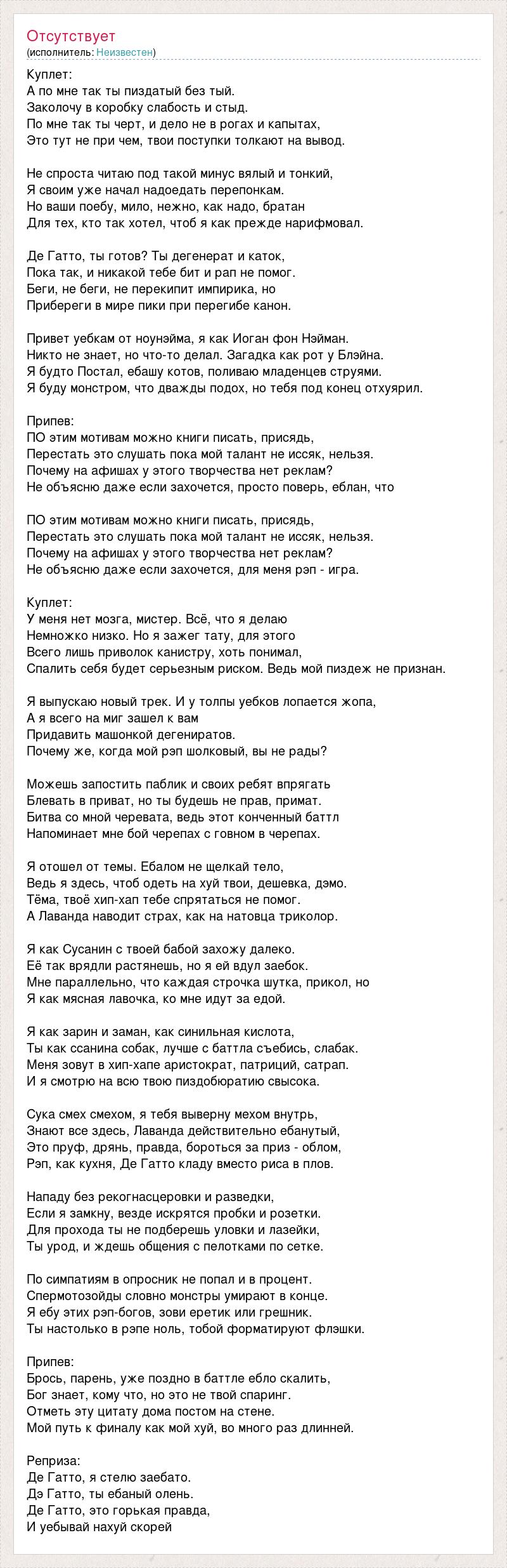Куплет: А по мне так ты пиздатый без тый. Заколочу в коробку слабость и стыд. По мне так ты черт, и дело не в рогах и капытах, Это тут не при чем, твои поступки толкают на вывод. Не спроста читаю под такой минус вялый и тонкий, Я своим уже начал надоедать перепонкам. Но ваши поебу, мило, нежно, как надо, братан Для тех, кто так хотел, чтоб я как прежде нарифмовал. Де Гатто, ты готов? Ты дегенерат и каток, Пока так, и никакой тебе бит и рап не помог. Беги, не беги, не перекипит импирика, но Прибереги в мире пики при перегибе канон. Привет уебкам от ноунэйма, я как Иоган фон Нэйман. Никто не знает, но что-то делал. Загадка как рот у Блэйна. Я будто Постал, ебашу котов, поливаю младенцев струями. Я буду монстром, что дважды подох, но тебя под конец отхуярил. Припев: ПО этим мотивам можно книги писать, присядь, Перестать это слушать пока мой талант не иссяк, нельзя. Почему на афишах у этого творчества нет реклам? Не объясню даже если захочется, просто поверь, еблан, что ПО этим мотивам можно книги писать, присядь, Перестать это слушать пока мой талант не иссяк, нельзя. Почему на афишах у этого творчества нет реклам? Не объясню даже если захочется, для меня рэп - игра. Куплет: У меня нет мозга, мистер. Всё, что я делаю Немножко низко. Но я зажег тату, для этого Всего лишь приволок канистру, хоть понимал, Спалить себя будет серьезным риском. Ведь мой пиздеж не признан. Я выпускаю новый трек. И у толпы уебков лопается жопа, А я всего на миг зашел к вам Придавить машонкой дегениратов. Почему же, когда мой рэп шолковый, вы не рады? Можешь запостить паблик и своих ребят впрягать Блевать в приват, но ты будешь не прав, примат. Битва со мной черевата, ведь этот конченный баттл Напоминает мне бой черепах с говном в черепах. Я отошел от темы. Ебалом не щелкай тело, Ведь я здесь, чтоб одеть на хуй твои, дешевка, дэмо. Тёма, твоё хип-хап тебе спрятаться не помог. А Лаванда наводит страх, как на натовца триколор. Я как Сусанин с твоей бабой захожу далеко. Её так врядли растянешь, но я ей вдул заебок. Мне параллельно, что каждая строчка шутка, прикол, но Я как мясная лавочка, ко мне идут за едой. Я как зарин и заман, как синильная кислота, Ты как ссанина собак, лучше с баттла съебись, слабак. Меня зовут в хип-хапе аристократ, патриций, сатрап. И я смотрю на всю твою пиздобюратию свысока. Сука смех смехом, я тебя выверну мехом внутрь, Знают все здесь, Лаванда действительно ебанутый, Это пруф, дрянь, правда, бороться за приз - облом, Рэп, как кухня, Де Гатто кладу вместо риса в плов. Нападу без рекогнасцеровки и разведки, Если я замкну, везде искрятся пробки и розетки. Для прохода ты не подберешь уловки и лазейки, Ты урод, и ждешь общения с пелотками по сетке. По симпатиям в опросник не попал и в процент. Спермотозойды словно монстры умирают в конце. Я ебу этих рэп-богов, зови еретик или грешник. Ты настолько в рэпе ноль, тобой форматируют флэшки. Припев: Брось, парень, уже поздно в баттле ебло скалить, Бог знает, кому что, но это не твой спаринг. Отметь эту цитату дома постом на стене. Мой путь к финалу как мой хуй, во много раз длинней. Реприза: Де Гатто, я стелю заебато. Дэ Гатто, ты ебаный олень. Де Гатто, это горькая правда, И уебывай нахуй скорей