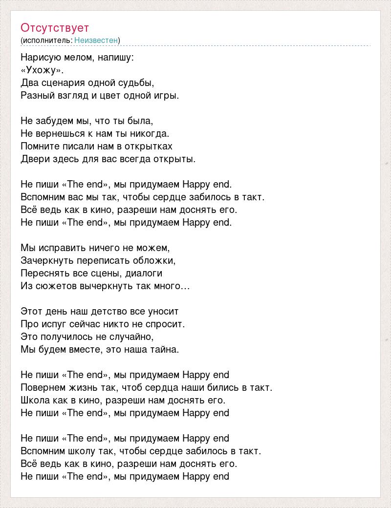 Нарисую мелом, напишу: «Ухожу». Два сценария одной судьбы, Разный взгляд и цвет одной игры. Не забудем мы, что ты была, Не вернешься к нам ты никогда. Помните писали нам в открытках Двери здесь для вас всегда открыты. Не пиши «The end», мы придумаем Happy end. Вспомним вас мы так, чтобы сердце забилось в такт. Всё ведь как в кино, разреши нам доснять его. Не пиши «The end», мы придумаем Happy end. Мы исправить ничего не можем, Зачеркнуть переписать обложки, Переснять все сцены, диалоги Из сюжетов вычеркнуть так много… Этот день наш детство все уносит Про испуг сейчас никто не спросит. Это получилось не случайно, Мы будем вместе, это наша тайна. Не пиши «The end», мы придумаем Happy end Повернем жизнь так, чтоб сердца наши бились в такт. Школа как в кино, разреши нам доснять его. Не пиши «The end», мы придумаем Happy end Не пиши «The end», мы придумаем Happy end Вспомним школу так, чтобы сердце забилось в такт. Всё ведь как в кино, разреши нам доснять его. Не пиши «The end», мы придумаем Happy end