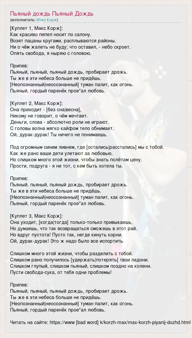 [Куплет 1, Макс Корж]: Как красиво пепел носит по салону. Возят пацаны кругами, расплываются районы. Ни о чём жалеть не буду; что оставил, - небо скроет. Опять свобода, я ныряю с головою. Припев: Пьяный, пьяный, пьяный дождь, пробирает дрожь. Ты же в эти небеса больше не придёшь. [Неопознанный|неосознанный] туман палит, как огонь. Пьяный, гордый паренёк прое*ал любовь. [Куплет 2, Макс Корж]: Она приходит - [без сна|весна], Никому не говорит, о чём мечтает. Деньги, слова - абсолютно роли не играют. С головы волна мягко кайфом тело обнимает. Ой, дурак-дурак! Ты ничего не понимаешь. Под огромным синим ливнем, где [остались|расстались] мы с тобой. Как же рано ваши дети улетают за любовью. Но слишком много этой жизни, чтобы знать полётам цену. Прости, подруга - я не тот, с кем быть хотела ты. Припев: Пьяный, пьяный, пьяный дождь, пробирает дрожь. Ты же в эти небеса больше не придёшь. [Неопознанный|неосознанный] туман палит, как огонь. Пьяный, гордый паренёк прое*ал любовь. [Куплет 3, Макс Корж]: Она уходит, [когда|тогда] только-только привыкаешь, Но думаешь, что так возвращаться сможешь в этот рай. Но вдруг пустота! Пусто так, негде кинуть корни. Ой, дурак-дурак! Это ж надо было все испортить. Слишком много этой жизни, чтобы разделить с тобой. Слишком рано получилось [удержать|потерять] твои ладони. Слишком глупый, слишком пьяный, слишком поздно на колени. Пусти свобода-сука, от тебя одни проблемы! Припев: Пьяный, пьяный, пьяный дождь, пробирает дрожь. Ты же в эти небеса больше не придёшь. [Неопознанный|неосознанный] туман палит, как огонь. Пьяный, гордый паренёк прое*ал любовь. Читать на сайте: https://www [bad word] k/korzh-max/max-korzh-piyanij-dozhd.html