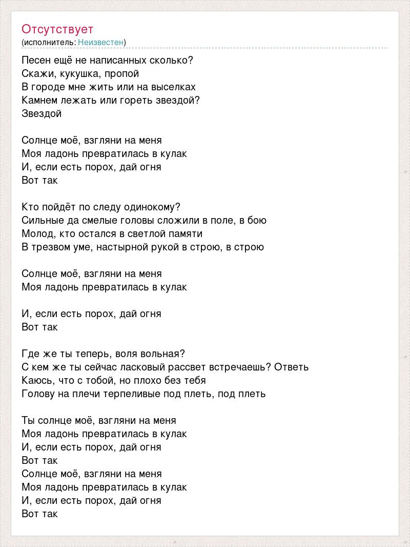 Песен ещё не написанных сколько? Скажи, кукушка, пропой В городе мне жить или на выселках Камнем лежать или гореть звездой? Звездой Солнце моё, взгляни на меня Моя ладонь превратилась в кулак И, если есть порох, дай огня Вот так Кто пойдёт по следу одинокому? Сильные да смелые головы сложили в поле, в бою Молод, кто остался в светлой памяти В трезвом уме, настырной рукой в строю, в строю Солнце моё, взгляни на меня Моя ладонь превратилась в кулак И, если есть порох, дай огня Вот так Где же ты теперь, воля вольная? С кем же ты сейчас ласковый рассвет встречаешь? Ответь Каюсь, что с тобой, но плохо без тебя Голову на плечи терпеливые под плеть, под плеть Ты солнце моё, взгляни на меня Моя ладонь превратилась в кулак И, если есть порох, дай огня Вот так Солнце моё, взгляни на меня Моя ладонь превратилась в кулак И, если есть порох, дай огня Вот так