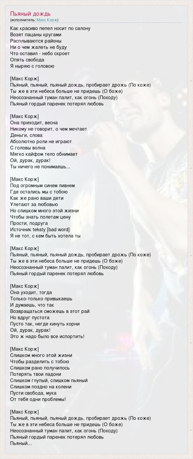 Как красиво пепел носит по салону Возят пацаны кругами Расплываются районы Ни о чем жалеть не буду Что оставил - небо скроет Опять свобода Я ныряю с головою [Макс Корж] Пьяный, пьяный, пьяный дождь, пробирает дрожь (По коже) Ты же в эти небеса больше не придешь (О боже) Неосознанный туман палит, как огонь (Походу) Пьяный гордый паренек потерял любовь [Макс Корж] Она приходит, весна Никому не говорит, о чем мечтает Деньги, слова Абсолютно роли не играют С головы волна Мягко кайфом тело обнимает Ой, дурак, дурак! Ты ничего не понимаешь... [Макс Корж] Под огромным синем ливнем Где остались мы с тобою Как же рано ваши дети Улетают за любовью Но слишком много этой жизни Чтобы знать полетам цену Прости, подруга Источник teksty [bad word] Я не тот, с кем быть хотела ты [Макс Корж] Пьяный, пьяный, пьяный дождь, пробирает дрожь (По коже) Ты же в эти небеса больше не придешь (О боже) Неосознанный туман палит, как огонь (Походу) Пьяный гордый паренек потерял любовь [Макс Корж] Она уходит, тогда Только-только привыкаешь И думаешь, что так Возвращаться сможешь в этот рай Но вдруг пустота Пусто так, негде кинуть корни Ой, дурак, дурак! Это ж надо было все испортить! [Макс Корж] Слишком много этой жизни Чтобы разделить с тобою Слишком рано получилось Потерять твои ладони Слишком глупый, слишком пьяный Слишком поздно на колени Пусти свобода, мука От тебя одни проблемы! [Макс Корж] Пьяный, пьяный, пьяный дождь, пробирает дрожь (По коже) Ты же в эти небеса больше не придешь (О боже) Неосознанный туман палит, как огонь (Походу) Пьяный гордый паренек потерял любовь Пьяный...