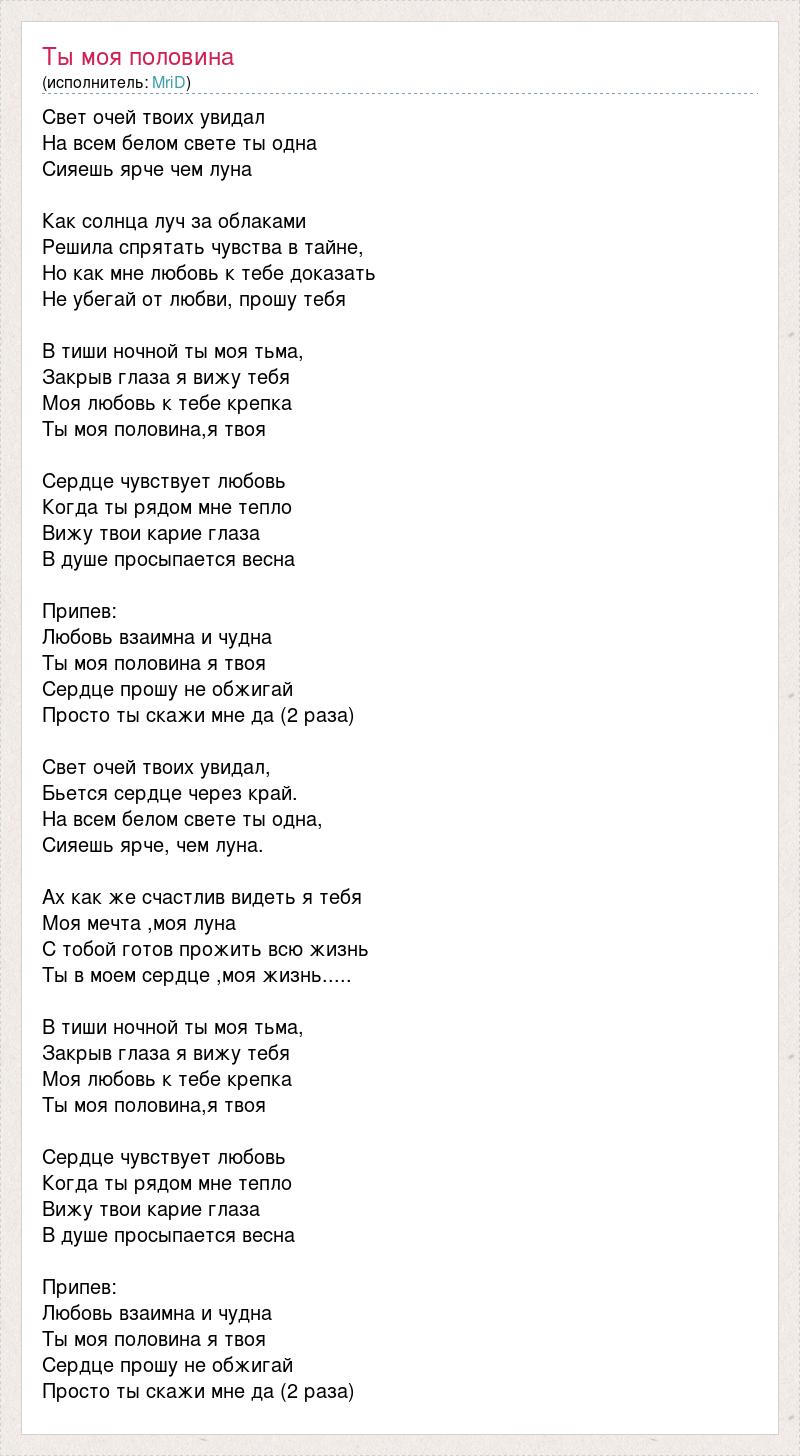 Свет очей твоих увидал На всем белом свете ты одна Сияешь ярче чем луна Как солнца луч за облаками Решила спрятать чувства в тайне, Но как мне любовь к тебе доказать Не убегай от любви, прошу тебя В тиши ночной ты моя тьма, Закрыв глаза я вижу тебя Моя любовь к тебе крепка Ты моя половина,я твоя Сердце чувствует любовь Когда ты рядом мне тепло Вижу твои карие глаза В душе просыпается весна Припев: Любовь взаимна и чудна Ты моя половина я твоя Сердце прошу не обжигай Просто ты скажи мне да (2 раза) Свет очей твоих увидал, Бьется сердце через край. На всем белом свете ты одна, Сияешь ярче, чем луна. Ах как же счастлив видеть я тебя Моя мечта ,моя луна С тобой готов прожить всю жизнь Ты в моем сердце ,моя жизнь..... В тиши ночной ты моя тьма, Закрыв глаза я вижу тебя Моя любовь к тебе крепка Ты моя половина,я твоя Сердце чувствует любовь Когда ты рядом мне тепло Вижу твои карие глаза В душе просыпается весна Припев: Любовь взаимна и чудна Ты моя половина я твоя Сердце прошу не обжигай Просто ты скажи мне да (2 раза)
