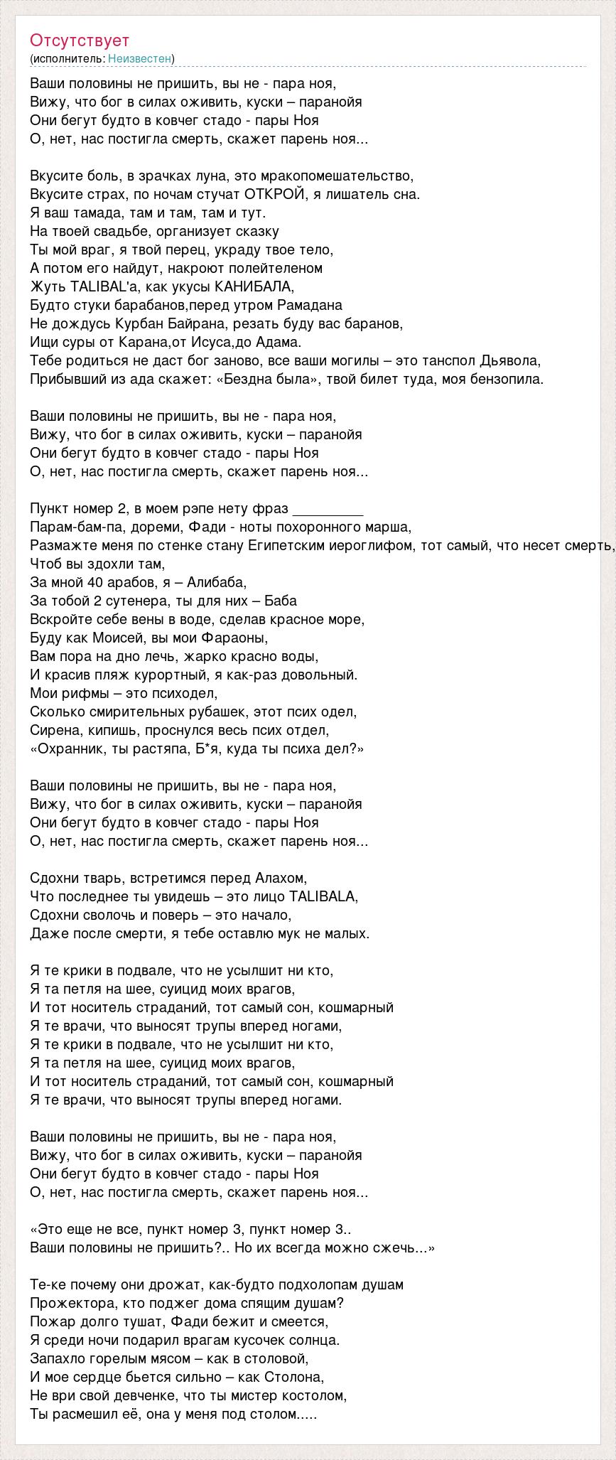 Ваши половины не пришить, вы не - пара ноя, Вижу, что бог в силах оживить, куски – паранойя Они бегут будто в ковчег стадо - пары Ноя О, нет, нас постигла смерть, скажет парень ноя... Вкусите боль, в зрачках луна, это мракопомешательство, Вкусите страх, по ночам стучат ОТКРОЙ, я лишатель сна. Я ваш тамада, там и там, там и тут. На твоей свадьбе, организует сказку Ты мой враг, я твой перец, украду твое тело, А потом его найдут, накроют полейтеленом Жуть TALIBAL'а, как укусы КАНИБАЛА, Будто стуки барабанов,перед утром Рамадана Не дождусь Курбан Байрана, резать буду вас баранов, Ищи суры от Карана,от Исуса,до Адама. Тебе родиться не даст бог заново, все ваши могилы – это танспол Дьявола, Прибывший из ада скажет: «Бездна была», твой билет туда, моя бензопила. Ваши половины не пришить, вы не - пара ноя, Вижу, что бог в силах оживить, куски – паранойя Они бегут будто в ковчег стадо - пары Ноя О, нет, нас постигла смерть, скажет парень ноя... Пункт номер 2, в моем рэпе нету фраз _________ Парам-бам-па, дореми, Фади - ноты похоронного марша, Размажте меня по стенке стану Египетским иероглифом, тот самый, что несет смерть, Чтоб вы здохли там, За мной 40 арабов, я – Алибаба, За тобой 2 сутенера, ты для них – Баба Вскройте себе вены в воде, сделав красное море, Буду как Моисей, вы мои Фараоны, Вам пора на дно лечь, жарко красно воды, И красив пляж курортный, я как-раз довольный. Мои рифмы – это психодел, Сколько смирительных рубашек, этот псих одел, Сирена, кипишь, проснулся весь псих отдел, «Охранник, ты растяпа, Б*я, куда ты психа дел?» Ваши половины не пришить, вы не - пара ноя, Вижу, что бог в силах оживить, куски – паранойя Они бегут будто в ковчег стадо - пары Ноя О, нет, нас постигла смерть, скажет парень ноя... Сдохни тварь, встретимся перед Алахом, Что последнее ты увидешь – это лицо TALIBALA, Сдохни сволочь и поверь – это начало, Даже после смерти, я тебе оставлю мук не малых. Я те крики в подвале, что не усылшит ни кто, Я та петля на шее, суицид моих врагов, И тот носитель страданий, тот самый сон, кошмарный Я те врачи, что выносят трупы вперед ногами, Я те крики в подвале, что не усылшит ни кто, Я та петля на шее, суицид моих врагов, И тот носитель страданий, тот самый сон, кошмарный Я те врачи, что выносят трупы вперед ногами. Ваши половины не пришить, вы не - пара ноя, Вижу, что бог в силах оживить, куски – паранойя Они бегут будто в ковчег стадо - пары Ноя О, нет, нас постигла смерть, скажет парень ноя... «Это еще не все, пункт номер 3, пункт номер 3.. Ваши половины не пришить?.. Но их всегда можно сжечь...» Те-ке почему они дрожат, как-будто подхолопам душам Прожектора, кто поджег дома спящим душам? Пожар долго тушат, Фади бежит и смеется, Я среди ночи подарил врагам кусочек солнца. Запахло горелым мясом – как в столовой, И мое сердце бьется сильно – как Столона, Не ври свой девченке, что ты мистер костолом, Ты расмешил её, она у меня под столом.....