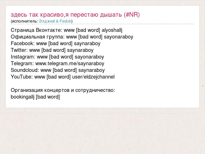 Страница Вконтакте: www [bad word] alyoshallj Официальная группа: www [bad word] sayonaraboy Facebook: www [bad word] saynaraboy Twitter: www [bad word] saynaraboy Instagram: www [bad word] sayonaraboy Telegram: www.telegram.me/saynaraboy Soundcloud: www [bad word] saynaraboy YouTube: www [bad word] user/eldzejchannel Организация концертов и сотрудничество: bookingallj [bad word]