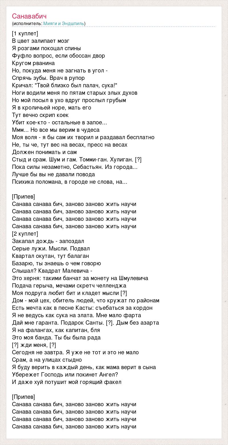 [1 куплет] В цвет залипает мозг Я розгами покоцал спины Фуфло вопрос, если обоссан двор Кругом рванина Но, покуда меня не загнать в угол - Спрячь зубы. Врач в рупор Кричал: "Твой близко был палач, сука!" Ноги водили меня по пятам старых злых духов Но мой посыл в ухо вдруг прослыл грубым Я в кроличьей норе, мать его Тут вечно скрип коек Убит кое-кто - остальные в запое... Ммм... Но все мы верим в чудеса Моя воля - я бы сам их творил и раздавал бесплатно Не, ты че, тут вес на весах, пресс на весах Должен понимать и сам Стыд и срам. Шум и гам. Томми-ган. Хулиган. [?] Пока силы незаметно, Себастьян. Из города... Лучше бы вы не давали повода Психика поломана, в городе не слова, на... [Припев] Санава санава бич, заново заново жить научи Санава санава бич, заново заново жить научи Санава санава бич, заново заново жить научи Санава санава бич, заново заново жить научи [2 куплет] Закапал дождь - запоздал Серые лужи. Мысли. Подвал Квартал окутан, тут балаган Базарю, ты знаешь о чем говорю Слышал? Квадрат Малевича - Это херня: такими банчат за монету на Шмулевича Подача герыча, мечами скретч челленджа Моя подруга любит бит и кладет мысли [?] Дом - мой цех, обитель людей, что кружат по районам Есть мечта как в песне Касты: съебаться за кордон Я не ведусь как сука на злата. Мне мало фарта Дай мне гаранта. Подарок Санты. [?]. Дым без азарта Я на фалангах, как капитан, бля Это моя банда. Ты бы была рада [?] жди меня, [?] Сегодня не завтра. Я уже не тот и это не мало Срам, а на улицах стыдно Я буду верить в каждый день, как мама верит в сына Убережет Господь или покинет Ангел? И даже хуй потушит мой горящий факел [Припев] Санава санава бич, заново заново жить научи Санава санава бич, заново заново жить научи Санава санава бич, заново заново жить научи Санава санава бич, заново заново жить научи
