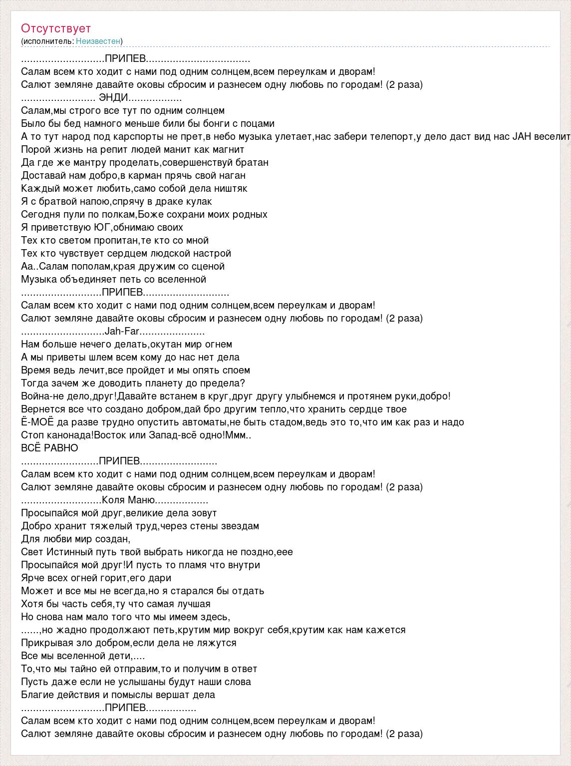 ............................ПРИПЕВ................................... Салам всем кто ходит с нами под одним солнцем,всем переулкам и дворам! Салют земляне давайте оковы сбросим и разнесем одну любовь по городам! (2 раза) ......................... ЭНДИ.................. Салам,мы строго все тут по одним солнцем Было бы бед намного меньше били бы бонги с поцами А то тут народ под карспорты не прет,в небо музыка улетает,нас забери телепорт,у дело даст вид нас JAH веселит Порой жизнь на репит людей манит как магнит Да где же мантру проделать,совершенствуй братан Доставай нам добро,в карман прячь свой наган Каждый может любить,само собой дела ништяк Я с братвой напою,спрячу в драке кулак Сегодня пули по полкам,Боже сохрани моих родных Я приветствую ЮГ,обнимаю своих Тех кто светом пропитан,те кто со мной Тех кто чувствует сердцем людской настрой Аа..Салам пополам,края дружим со сценой Музыка объединяет петь со вселенной ...........................ПРИПЕВ............................. Салам всем кто ходит с нами под одним солнцем,всем переулкам и дворам! Салют земляне давайте оковы сбросим и разнесем одну любовь по городам! (2 раза) ............................Jah-Far...................... Нам больше нечего делать,окутан мир огнем А мы приветы шлем всем кому до нас нет дела Время ведь лечит,все пройдет и мы опять споем Тогда зачем же доводить планету до предела? Война-не дело,друг!Давайте встанем в круг,друг другу улыбнемся и протянем руки,добро! Вернется все что создано добром,дай бро другим тепло,что хранить сердце твое Ё-МОЁ да разве трудно опустить автоматы,не быть стадом,ведь это то,что им как раз и надо Стоп канонада!Восток или Запад-всё одно!Ммм.. ВСЁ РАВНО ..........................ПРИПЕВ.......................... Салам всем кто ходит с нами под одним солнцем,всем переулкам и дворам! Салют земляне давайте оковы сбросим и разнесем одну любовь по городам! (2 раза) ...........................Коля Маню.................. Просыпайся мой друг,великие дела зовут Добро хранит тяжелый труд,через стены звездам Для любви мир создан, Свет Истинный путь твой выбрать никогда не поздно,еее Просыпайся мой друг!И пусть то пламя что внутри Ярче всех огней горит,его дари Может и все мы не всегда,но я старался бы отдать Хотя бы часть себя,ту что самая лучшая Но снова нам мало того что мы имеем здесь, ......,но жадно продолжают петь,крутим мир вокруг себя,крутим как нам кажется Прикрывая зло добром,если дела не ляжутся Все мы вселенной дети,.... То,что мы тайно ей отправим,то и получим в ответ Пусть даже если не услышаны будут наши слова Благие действия и помыслы вершат дела ............................ПРИПЕВ................. Салам всем кто ходит с нами под одним солнцем,всем переулкам и дворам! Салют земляне давайте оковы сбросим и разнесем одну любовь по городам! (2 раза)