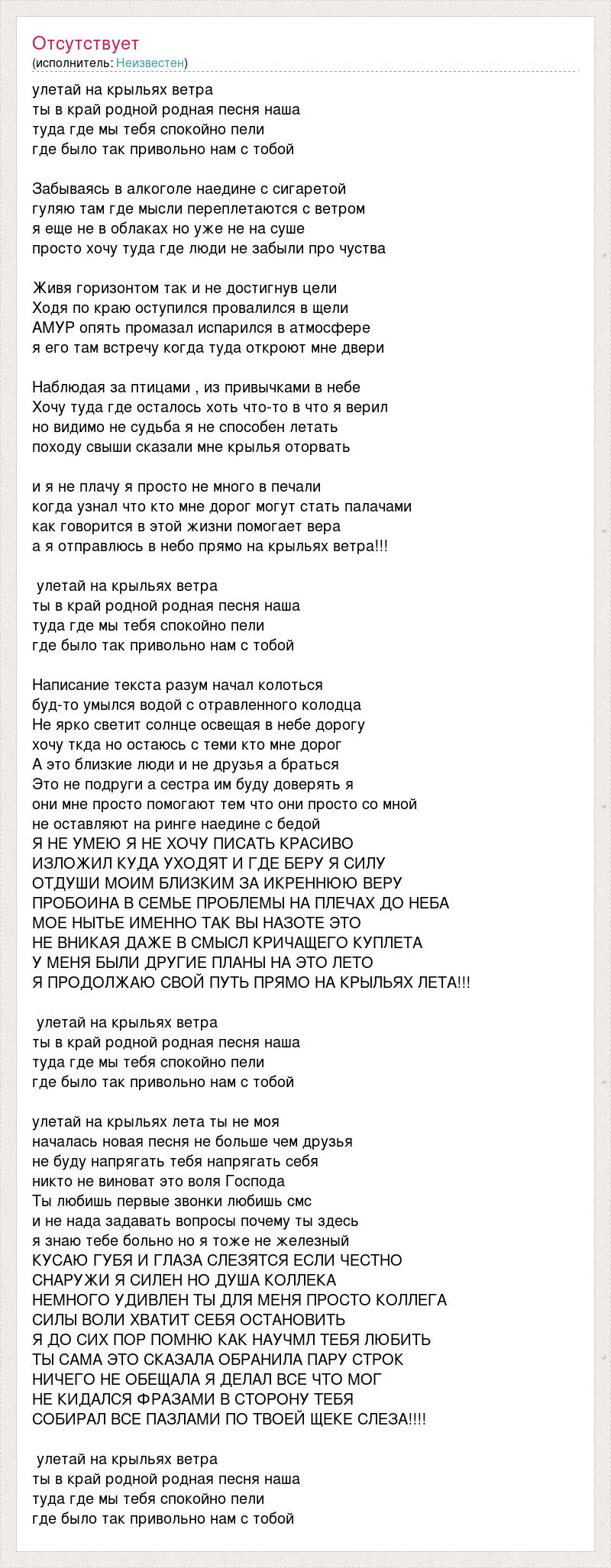 улетай на крыльях ветра ты в край родной родная песня наша туда где мы тебя спокойно пели где было так привольно нам с тобой Забываясь в алкоголе наедине с сигаретой гуляю там где мысли переплетаются с ветром я еще не в облаках но уже не на суше просто хочу туда где люди не забыли про чуства Живя горизонтом так и не достигнув цели Ходя по краю оступился провалился в щели АМУР опять промазал испарился в атмосфере я его там встречу когда туда откроют мне двери Наблюдая за птицами , из привычками в небе Хочу туда где осталось хоть что-то в что я верил но видимо не судьба я не способен летать походу свыши сказали мне крылья оторвать и я не плачу я просто не много в печали когда узнал что кто мне дорог могут стать палачами как говорится в этой жизни помогает вера а я отправлюсь в небо прямо на крыльях ветра!!! улетай на крыльях ветра ты в край родной родная песня наша туда где мы тебя спокойно пели где было так привольно нам с тобой Написание текста разум начал колоться буд-то умылся водой с отравленного колодца Не ярко светит солнце освещая в небе дорогу хочу ткда но остаюсь с теми кто мне дорог А это близкие люди и не друзья а браться Это не подруги а сестра им буду доверять я они мне просто помогают тем что они просто со мной не оставляют на ринге наедине с бедой Я НЕ УМЕЮ Я НЕ ХОЧУ ПИСАТЬ КРАСИВО ИЗЛОЖИЛ КУДА УХОДЯТ И ГДЕ БЕРУ Я СИЛУ ОТДУШИ МОИМ БЛИЗКИМ ЗА ИКРЕННЮЮ ВЕРУ ПРОБОИНА В СЕМЬЕ ПРОБЛЕМЫ НА ПЛЕЧАХ ДО НЕБА МОЕ НЫТЬЕ ИМЕННО ТАК ВЫ НАЗОТЕ ЭТО НЕ ВНИКАЯ ДАЖЕ В СМЫСЛ КРИЧАЩЕГО КУПЛЕТА У МЕНЯ БЫЛИ ДРУГИЕ ПЛАНЫ НА ЭТО ЛЕТО Я ПРОДОЛЖАЮ СВОЙ ПУТЬ ПРЯМО НА КРЫЛЬЯХ ЛЕТА!!! улетай на крыльях ветра ты в край родной родная песня наша туда где мы тебя спокойно пели где было так привольно нам с тобой улетай на крыльях лета ты не моя началась новая песня не больше чем друзья не буду напрягать тебя напрягать себя никто не виноват это воля Господа Ты любишь первые звонки любишь смс и не нада задавать вопросы почему ты здесь я знаю тебе больно но я тоже не железный КУСАЮ ГУБЯ И ГЛАЗА СЛЕЗЯТСЯ ЕСЛИ ЧЕСТНО СНАРУЖИ Я СИЛЕН НО ДУША КОЛЛЕКА НЕМНОГО УДИВЛЕН ТЫ ДЛЯ МЕНЯ ПРОСТО КОЛЛЕГА СИЛЫ ВОЛИ ХВАТИТ СЕБЯ ОСТАНОВИТЬ Я ДО СИХ ПОР ПОМНЮ КАК НАУЧМЛ ТЕБЯ ЛЮБИТЬ ТЫ САМА ЭТО СКАЗАЛА ОБРАНИЛА ПАРУ СТРОК НИЧЕГО НЕ ОБЕЩАЛА Я ДЕЛАЛ ВСЕ ЧТО МОГ НЕ КИДАЛСЯ ФРАЗАМИ В СТОРОНУ ТЕБЯ СОБИРАЛ ВСЕ ПАЗЛАМИ ПО ТВОЕЙ ЩЕКЕ СЛЕЗА!!!! улетай на крыльях ветра ты в край родной родная песня наша туда где мы тебя спокойно пели где было так привольно нам с тобой