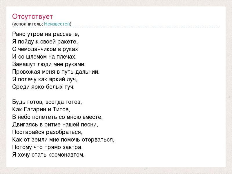 Рано утром на рассвете, Я пойду к своей ракете, С чемоданчиком в руках И со шлемом на плечах. Замашут люди мне руками, Провожая меня в путь дальний. Я полечу как яркий луч, Среди ярко-белых туч. Будь готов, всегда готов, Как Гагарин и Титов, В небо полететь со мною вместе, Двигаясь в ритме нашей песни, Постарайся разобраться, Как от земли мне помочь оторваться, Потому что прямо завтра, Я хочу стать космонавтом.