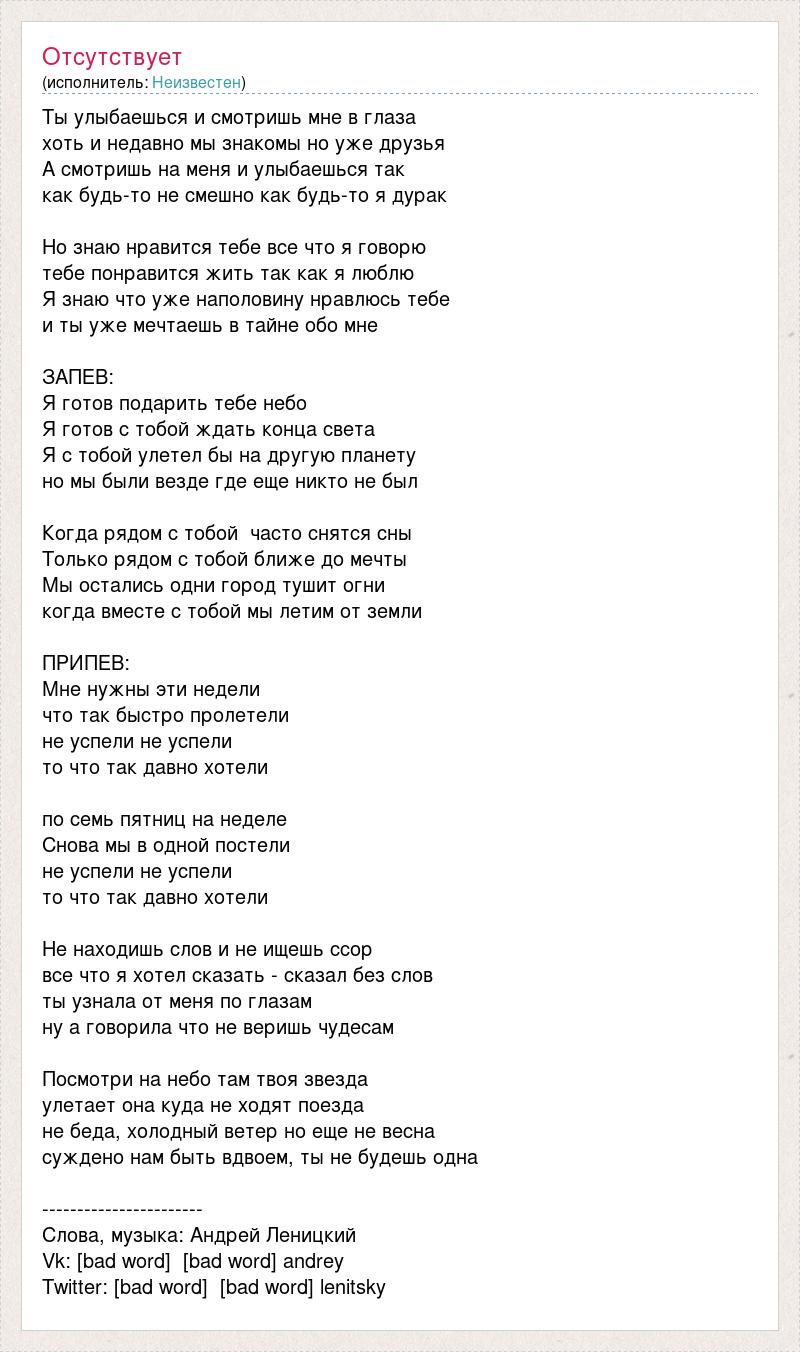 Ты улыбаешься и смотришь мне в глаза хоть и недавно мы знакомы но уже друзья А смотришь на меня и улыбаешься так как будь-то не смешно как будь-то я дурак Но знаю нравится тебе все что я говорю тебе понравится жить так как я люблю Я знаю что уже наполовину нравлюсь тебе и ты уже мечтаешь в тайне обо мне ЗАПЕВ: Я готов подарить тебе небо Я готов с тобой ждать конца света Я с тобой улетел бы на другую планету но мы были везде где еще никто не был Когда рядом с тобой часто снятся сны Только рядом с тобой ближе до мечты Мы остались одни город тушит огни когда вместе с тобой мы летим от земли ПРИПЕВ: Мне нужны эти недели что так быстро пролетели не успели не успели то что так давно хотели по семь пятниц на неделе Снова мы в одной постели не успели не успели то что так давно хотели Не находишь слов и не ищешь ссор все что я хотел сказать - сказал без слов ты узнала от меня по глазам ну а говорила что не веришь чудесам Посмотри на небо там твоя звезда улетает она куда не ходят поезда не беда, холодный ветер но еще не весна суждено нам быть вдвоем, ты не будешь одна ----------------------- Слова, музыка: Андрей Леницкий Vk: [bad word] [bad word] andrey Twitter: [bad word] [bad word] lenitsky