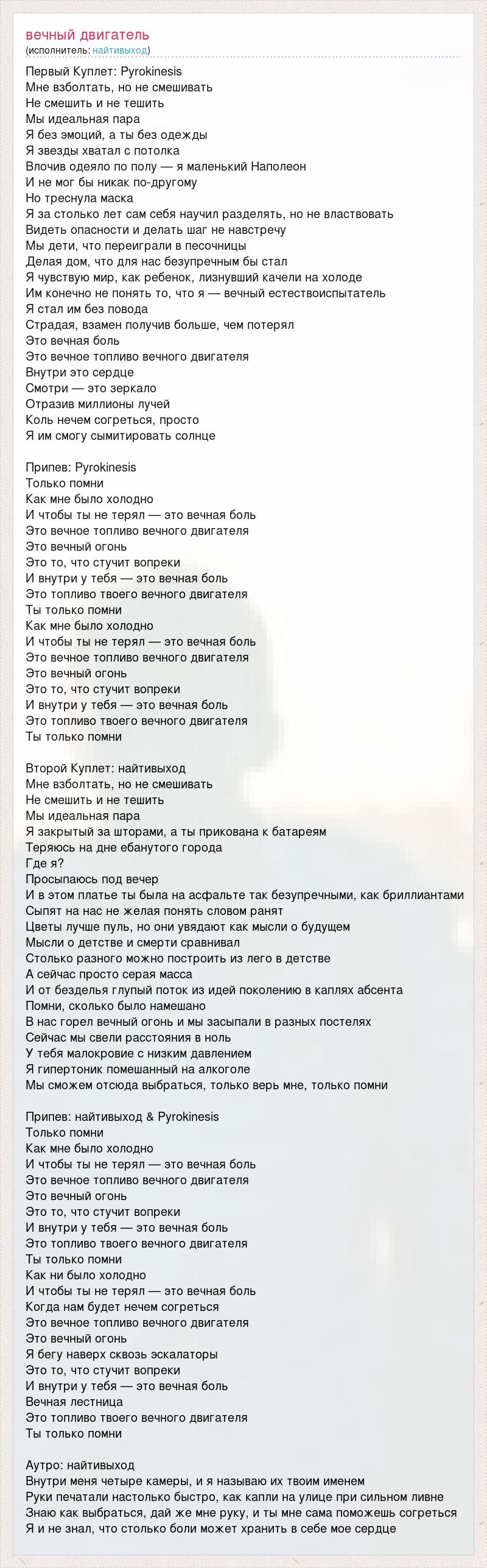 Первый Куплет: Pyrokinesis Мне взболтать, но не смешивать Не смешить и не тешить Мы идеальная пара Я без эмоций, а ты без одежды Я звезды хватал с потолка Влочив одеяло по полу — я маленький Наполеон И не мог бы никак по-другому Но треснула маска Я за столько лет сам себя научил разделять, но не властвовать Видеть опасности и делать шаг не навстречу Мы дети, что переиграли в песочницы Делая дом, что для нас безупречным бы стал Я чувствую мир, как ребенок, лизнувший качели на холоде Им конечно не понять то, что я — вечный естествоиспытатель Я стал им без повода Страдая, взамен получив больше, чем потерял Это вечная боль Это вечное топливо вечного двигателя Внутри это сердце Смотри — это зеркало Отразив миллионы лучей Коль нечем согреться, просто Я им смогу сымитировать солнце Припев: Pyrokinesis Только помни Как мне было холодно И чтобы ты не терял — это вечная боль Это вечное топливо вечного двигателя Это вечный огонь Это то, что стучит вопреки И внутри у тебя — это вечная боль Это топливо твоего вечного двигателя Ты только помни Как мне было холодно И чтобы ты не терял — это вечная боль Это вечное топливо вечного двигателя Это вечный огонь Это то, что стучит вопреки И внутри у тебя — это вечная боль Это топливо твоего вечного двигателя Ты только помни Второй Куплет: найтивыход Мне взболтать, но не смешивать Не смешить и не тешить Мы идеальная пара Я закрытый за шторами, а ты прикована к батареям Теряюсь на дне ебанутого города Где я? Просыпаюсь под вечер И в этом платье ты была на асфальте так безупречными, как бриллиантами Сыпят на нас не желая понять словом ранят Цветы лучше пуль, но они увядают как мысли о будущем Мысли о детстве и смерти сравнивал Столько разного можно построить из лего в детстве А сейчас просто серая масса И от безделья глупый поток из идей поколению в каплях абсента Помни, сколько было намешано В нас горел вечный огонь и мы засыпали в разных постелях Сейчас мы свели расстояния в ноль У тебя малокровие с низким давлением Я гипертоник помешанный на алкоголе Мы сможем отсюда выбраться, только верь мне, только помни Припев: найтивыход & Pyrokinesis Только помни Как мне было холодно И чтобы ты не терял — это вечная боль Это вечное топливо вечного двигателя Это вечный огонь Это то, что стучит вопреки И внутри у тебя — это вечная боль Это топливо твоего вечного двигателя Ты только помни Как ни было холодно И чтобы ты не терял — это вечная боль Когда нам будет нечем согреться Это вечное топливо вечного двигателя Это вечный огонь Я бегу наверх сквозь эскалаторы Это то, что стучит вопреки И внутри у тебя — это вечная боль Вечная лестница Это топливо твоего вечного двигателя Ты только помни Аутро: найтивыход Внутри меня четыре камеры, и я называю их твоим именем Руки печатали настолько быстро, как капли на улице при сильном ливне Знаю как выбраться, дай же мне руку, и ты мне сама поможешь согреться Я и не знал, что столько боли может хранить в себе мое сердце