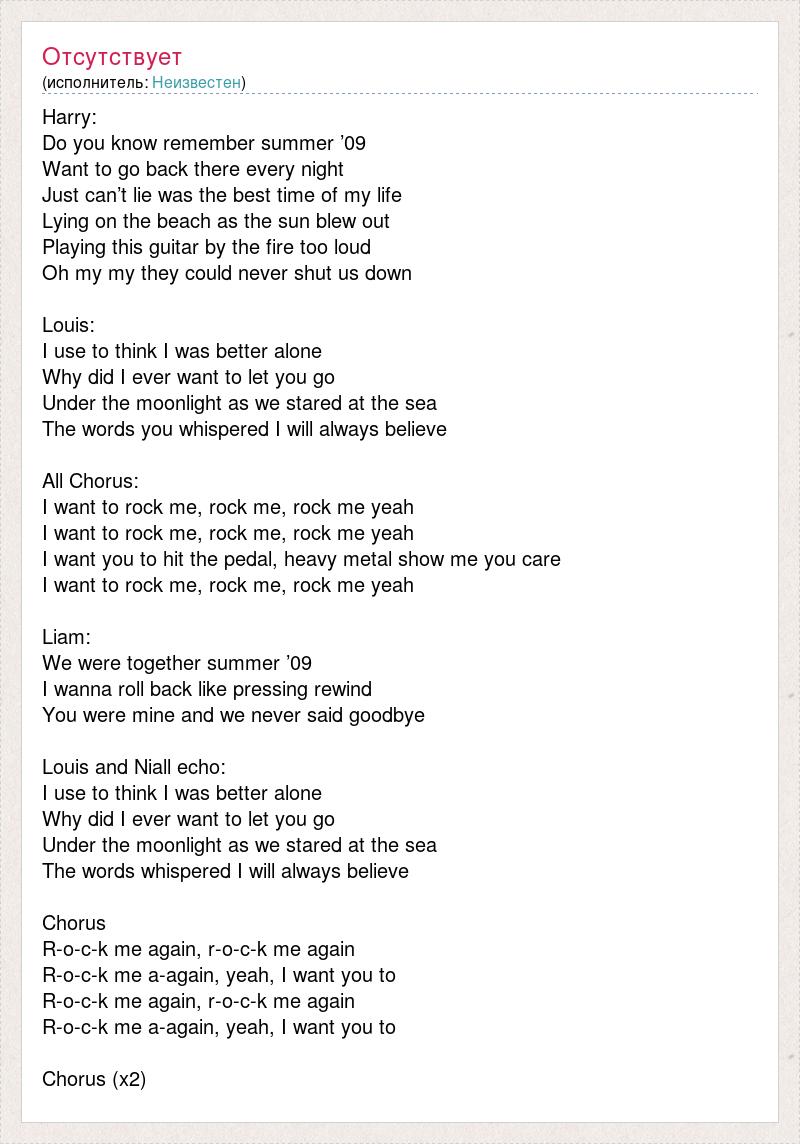 Harry: Do you know remember summer ’09 Want to go back there every night Just can’t lie was the best time of my life Lying on the beach as the sun blew out Playing this guitar by the fire too loud Oh my my they could never shut us down Louis: I use to think I was better alone Why did I ever want to let you go Under the moonlight as we stared at the sea The words you whispered I will always believe All Chorus: I want to rock me, rock me, rock me yeah I want to rock me, rock me, rock me yeah I want you to hit the pedal, heavy metal show me you care I want to rock me, rock me, rock me yeah Liam: We were together summer ’09 I wanna roll back like pressing rewind You were mine and we never said goodbye Louis and Niall echo: I use to think I was better alone Why did I ever want to let you go Under the moonlight as we stared at the sea The words whispered I will always believe Chorus R-o-c-k me again, r-o-c-k me again R-o-c-k me a-again, yeah, I want you to R-o-c-k me again, r-o-c-k me again R-o-c-k me a-again, yeah, I want you to Chorus (x2)