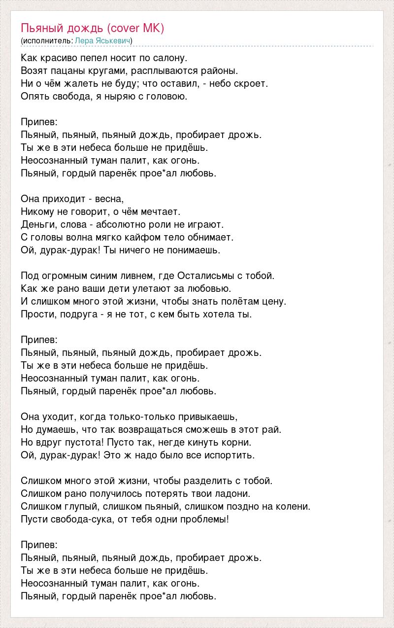 Как красиво пепел носит по салону. Возят пацаны кругами, расплываются районы. Ни о чём жалеть не буду; что оставил, - небо скроет. Опять свобода, я ныряю с головою. Припев: Пьяный, пьяный, пьяный дождь, пробирает дрожь. Ты же в эти небеса больше не придёшь. Неосознанный туман палит, как огонь. Пьяный, гордый паренёк прое*ал любовь. Она приходит - весна, Никому не говорит, о чём мечтает. Деньги, слова - абсолютно роли не играют. С головы волна мягко кайфом тело обнимает. Ой, дурак-дурак! Ты ничего не понимаешь. Под огромным синим ливнем, где Осталисьмы с тобой. Как же рано ваши дети улетают за любовью. И слишком много этой жизни, чтобы знать полётам цену. Прости, подруга - я не тот, с кем быть хотела ты. Припев: Пьяный, пьяный, пьяный дождь, пробирает дрожь. Ты же в эти небеса больше не придёшь. Неосознанный туман палит, как огонь. Пьяный, гордый паренёк прое*ал любовь. Она уходит, когда только-только привыкаешь, Но думаешь, что так возвращаться сможешь в этот рай. Но вдруг пустота! Пусто так, негде кинуть корни. Ой, дурак-дурак! Это ж надо было все испортить. Слишком много этой жизни, чтобы разделить с тобой. Слишком рано получилось потерять твои ладони. Слишком глупый, слишком пьяный, слишком поздно на колени. Пусти свобода-сука, от тебя одни проблемы! Припев: Пьяный, пьяный, пьяный дождь, пробирает дрожь. Ты же в эти небеса больше не придёшь. Неосознанный туман палит, как огонь. Пьяный, гордый паренёк прое*ал любовь.