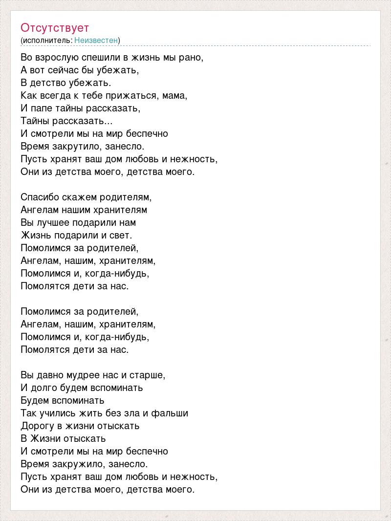 Во взрослую спешили в жизнь мы рано, А вот сейчас бы убежать, В детство убежать. Как всегда к тебе прижаться, мама, И папе тайны рассказать, Тайны рассказать... И смотрели мы на мир беспечно Время закрутило, занесло. Пусть хранят ваш дом любовь и нежность, Они из детства моего, детства моего. Спасибо скажем родителям, Ангелам нашим хранителям Вы лучшее подарили нам Жизнь подарили и свет. Помолимся за родителей, Ангелам, нашим, хранителям, Помолимся и, когда-нибудь, Помолятся дети за нас. Помолимся за родителей, Ангелам, нашим, хранителям, Помолимся и, когда-нибудь, Помолятся дети за нас. Вы давно мудрее нас и старше, И долго будем вспоминать Будем вспоминать Так учились жить без зла и фальши Дорогу в жизни отыскать В Жизни отыскать И смотрели мы на мир беспечно Время закружило, занесло. Пусть хранят ваш дом любовь и нежность, Они из детства моего, детства моего.